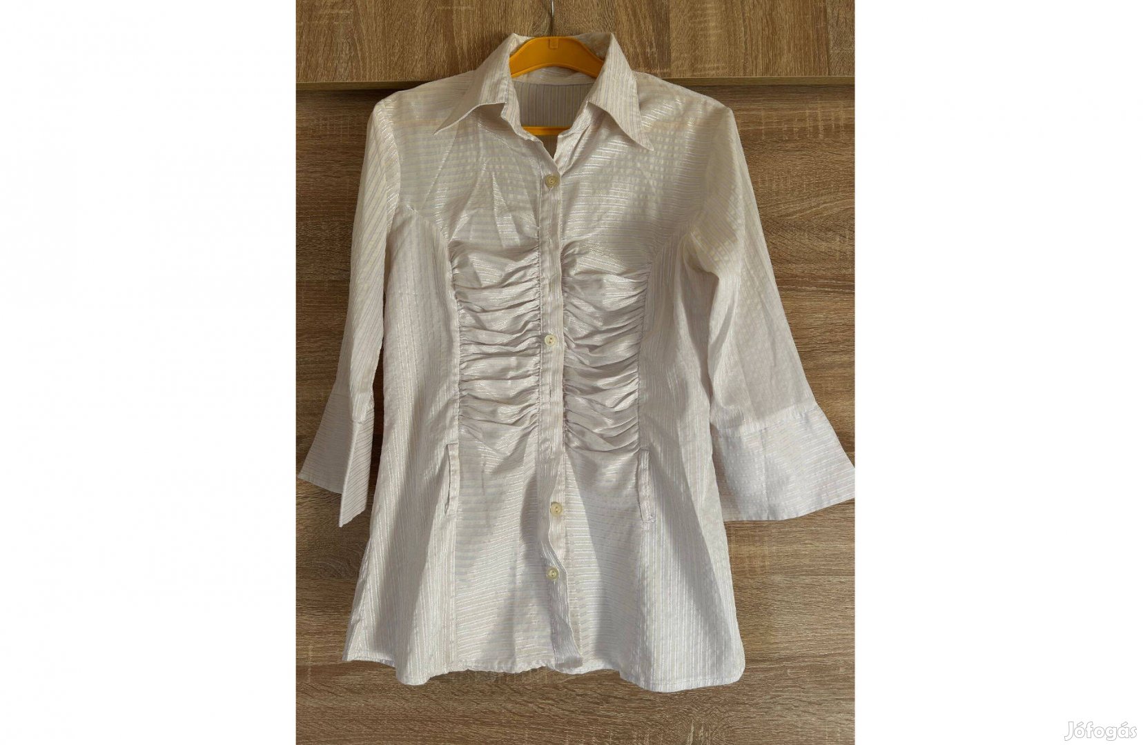 Fehér, enyhén csillogó anyagú blúz, 3/4-es ujjal. Pontos méret a képeken található. Személyesen Balatonboglár-Fonyód környékén átvehető.