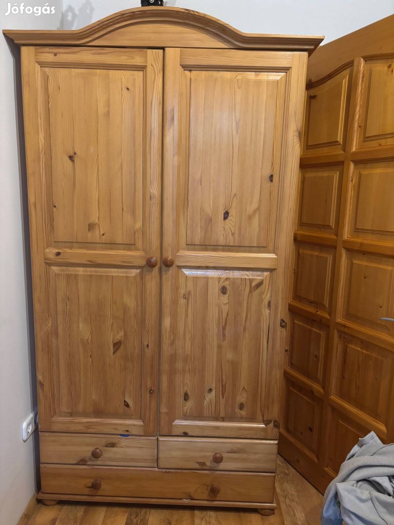Eladó jó állapotú fenyőbútor egyben ( polcos szekrény, ruhás szekrény, ágy, komód).