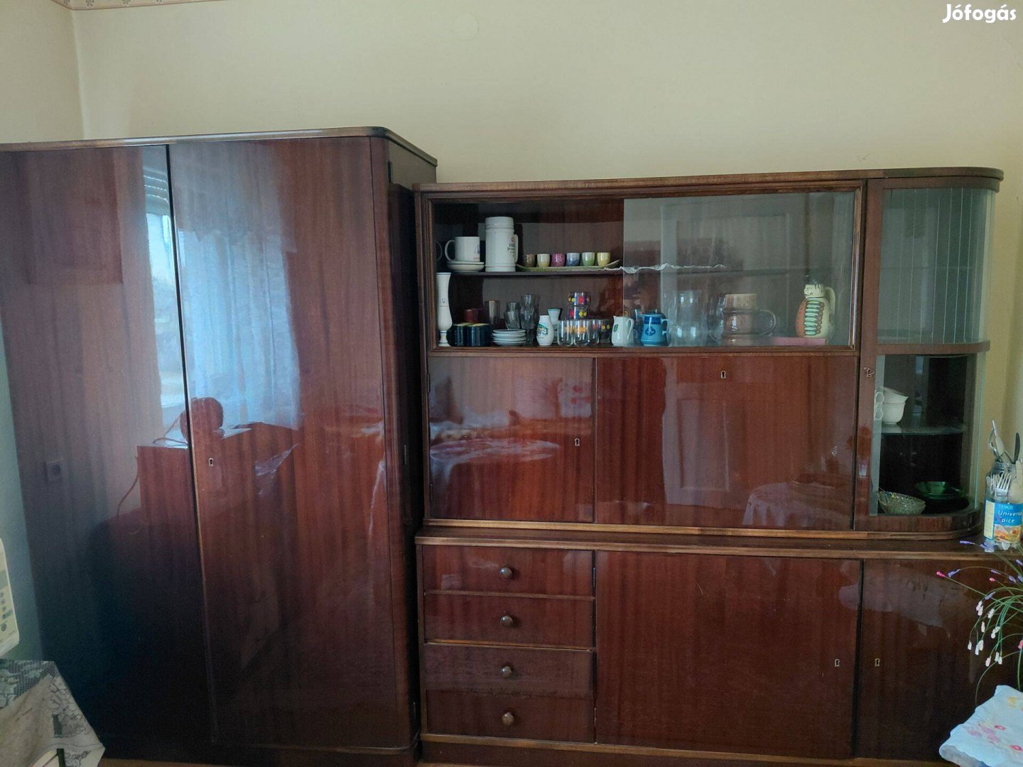 Eladó a képeken látható régi típusú szekrénysor, vitrines tálalóval és külön állószekrénnyel.