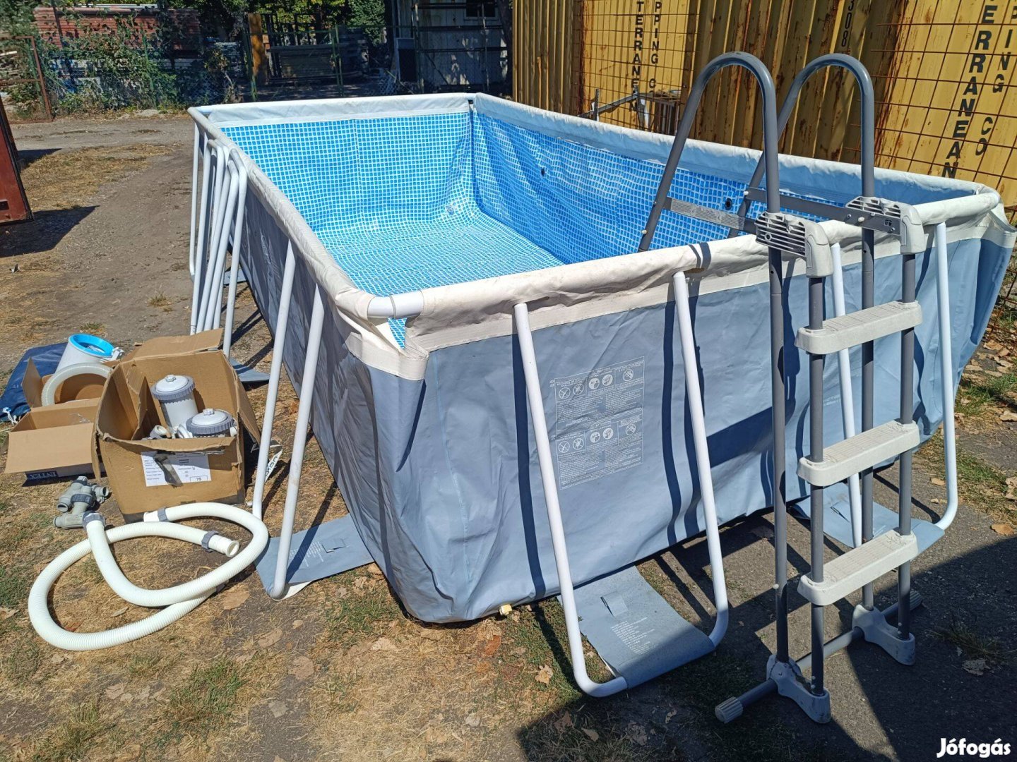 Jó állapotban, az összes képeken látható tartozékkal együtt. Létra, 2 db intex szivattyú, merülő szűrő, medence takaró, csövek, tartozékok. Nagy méret, 488*244 cm-es, 107 cm magas, kb. 10-12 m3 víz megy bele.
