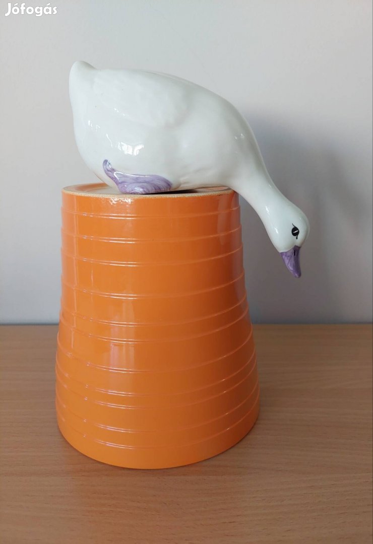 kerámia liba figura, a polc szélére helyezve lógatja a fejét. Hossza: 17 cm. A narancssárga kaspó