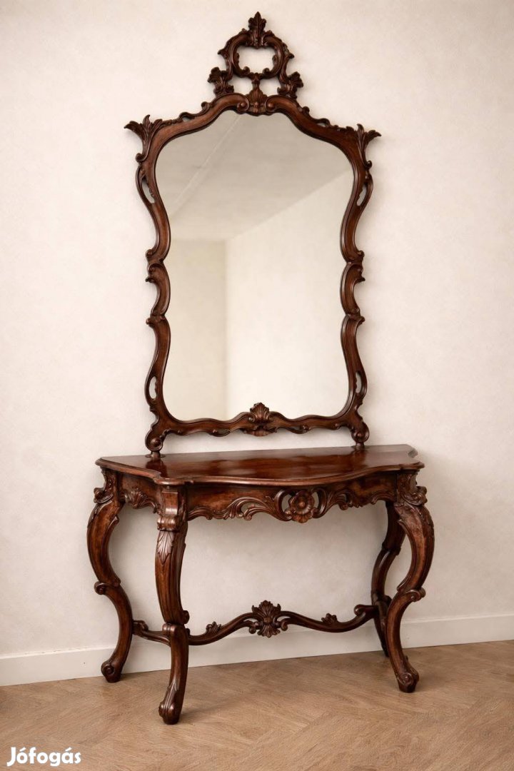 Különleges megjelenésű, gazdagon faragott klasszikus konzolasztal és tükör szett, amely azonnal eleganciát és karaktert ad bármely térnek.