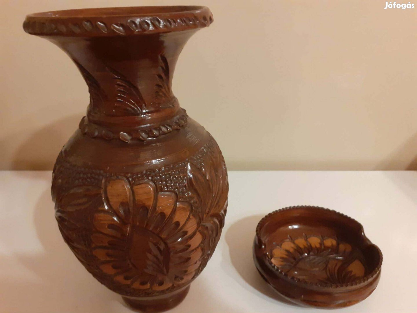 Hibátlan, vitrin minőségű disztárgyak. Jelzett, "Korond" felirattal. A váza 20 cm magas, a hamutál 10 cm átmérőjű. A kettő disztárgy barna és világos, u.n. "famintás" díszítésű.