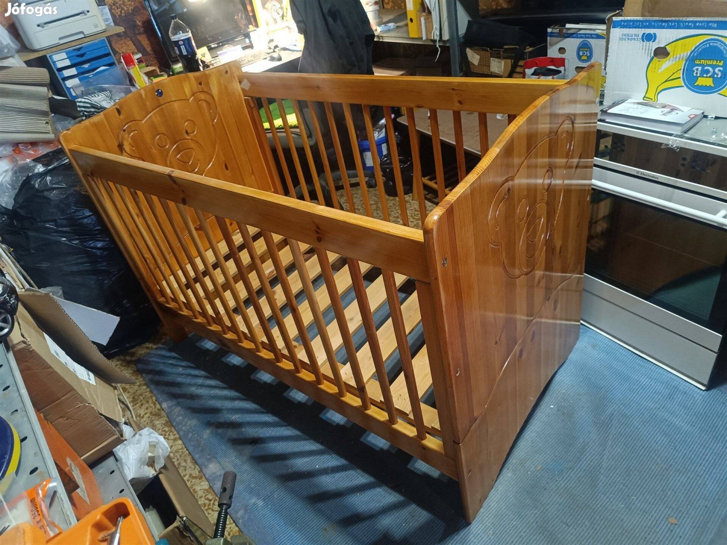 Jó állapotban, fenyőből készült, minőségi kiságy. A rácsok kivehetőek, bármelyik. Átalakítható sima ággyá a későbbiekben, Az ágyrács is 2 féle magasságban állítható. Jópofa, macis dekorral. Mérete: 78 x 144 x 98 cm (szél x hossz x mag), matrac méret 70 x 140 cm. Kérdésre szívesen válaszolok, nézd meg a többi hirdetésemet is!