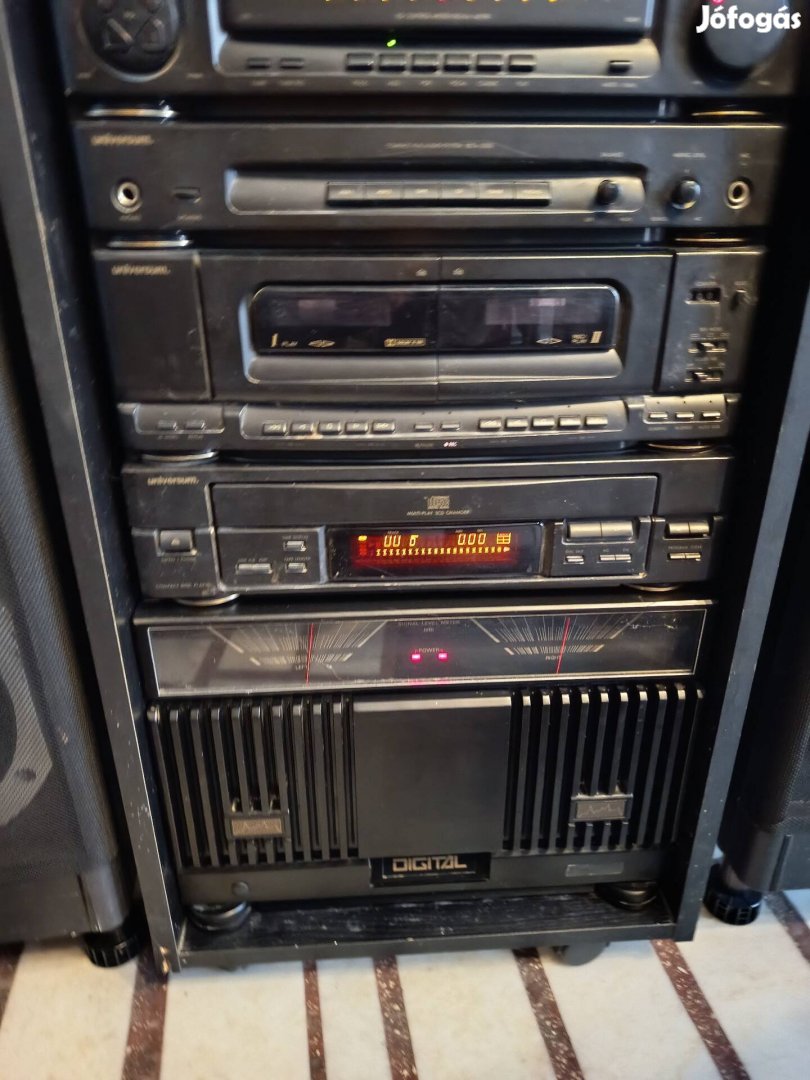 Universum Beta 2000 hifi torony fellelt állapotban eladó.Saját állványával, működő távirányítóval,gyári álló hangfalaival .4 hangfal kimenet,2 AUX,sorrund hangzás,EQ, mindket oldal oda-vissza játszó magnó,3cd-s lejatszó,rádió. Magnót szíjazni kell,a cd tálca nem nyílik az is szíjcseres .Rádió tökeletes,lemezjátszó indul de tű kell bele.Auxon tökeletesen szól.Merete es súlya miatt csak szemelyes átvetel Kaposváron.