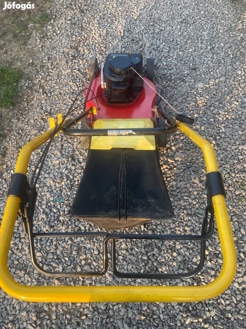Eladó a képen látható Wolf-Garten önjárós benzines fűnyíró, fűgyűjtő kosárral.