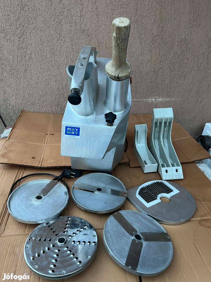 A képen látható zöldségszeletelő ,sajtdaráló gép 4 db szeletelő tárcsával ,és egy kockázóval jó állapotban eladó .