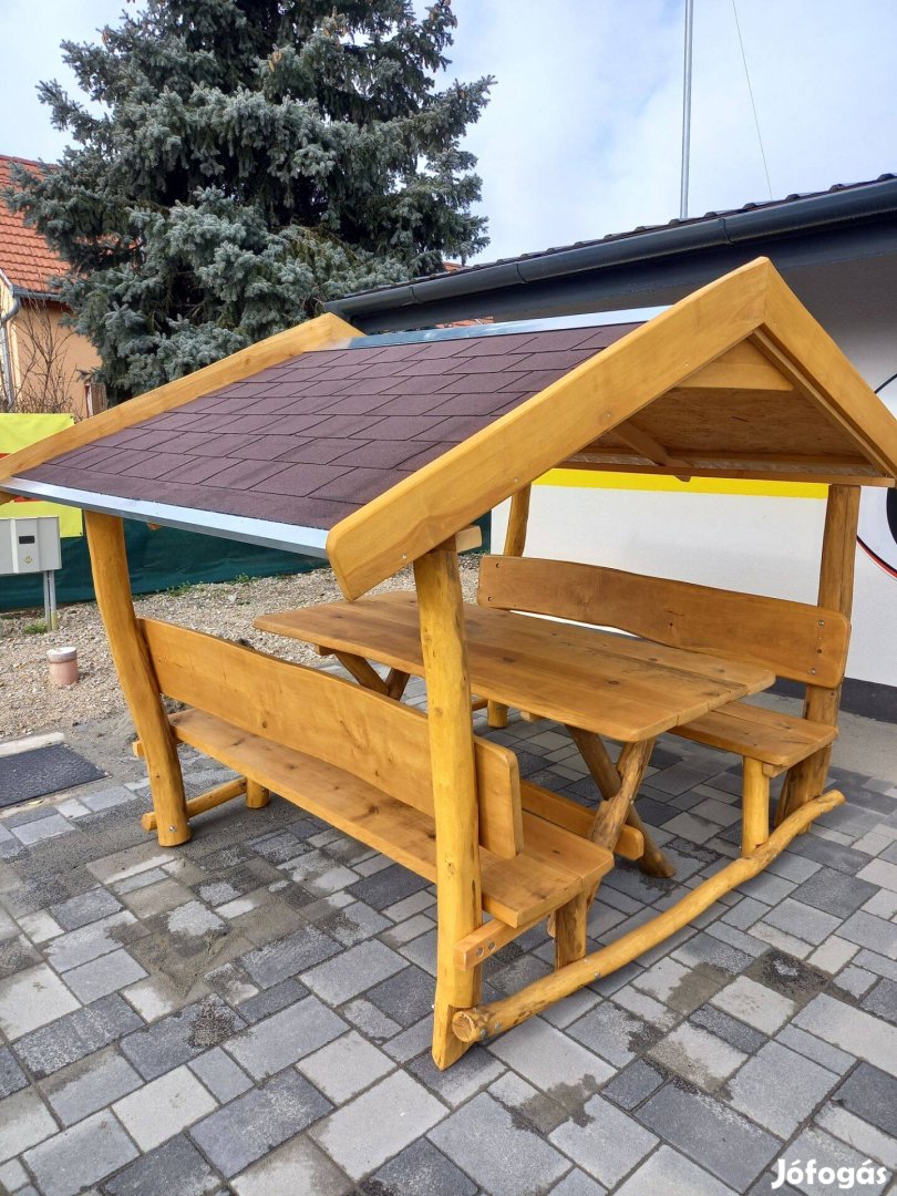 A tető és a padok egybeépítve, az asztal külön mozgatható.