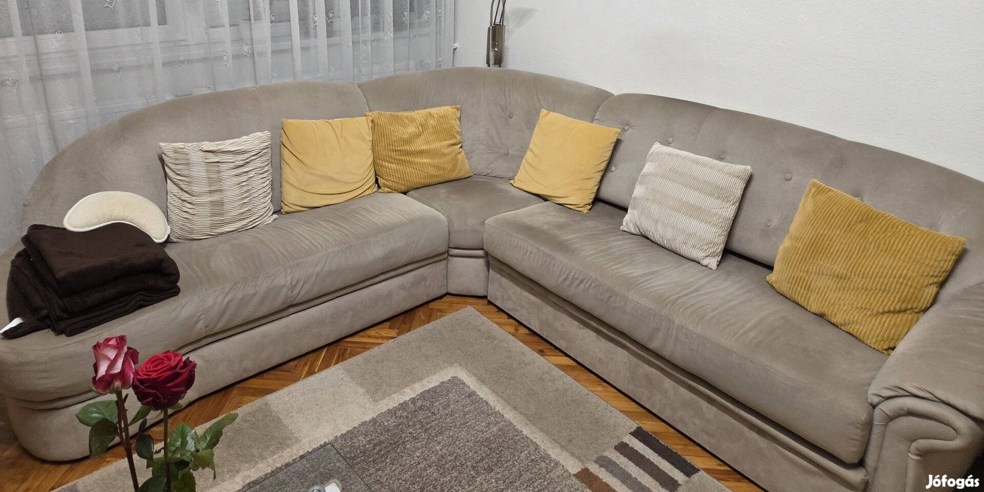 Eladó a képen látható nappali sarok ülőgarnitúra 275 cm x 250 cm, ágyneműtartóval és kihúzható vendégágy funkcióval. Az ár tartalmazza a hozzá tartozó fotelt, lábtartót és 6 díszpárnát is. Megkímélt állapotban.