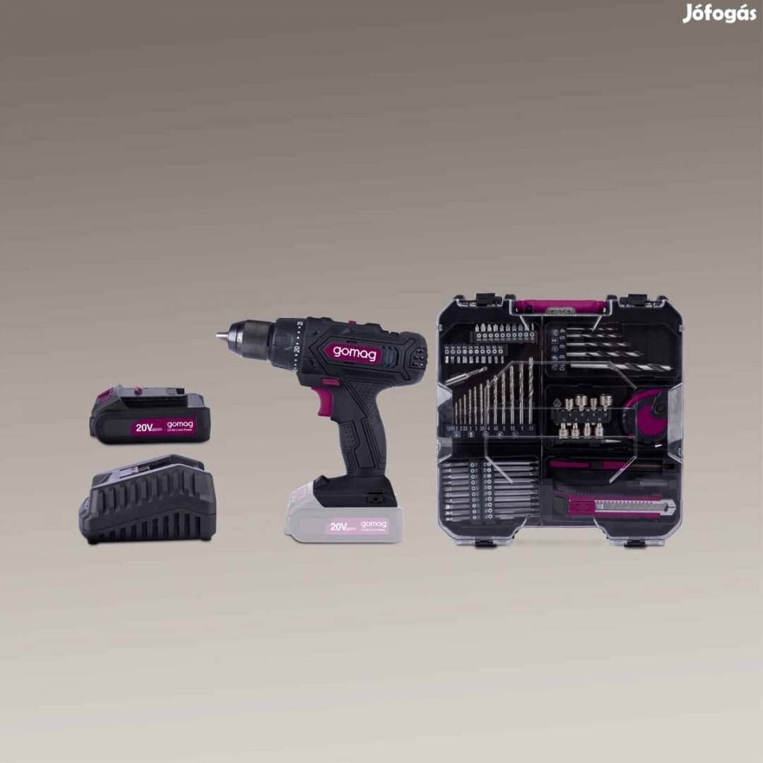 Mobil műhely akkus fúróval és kiterjedt tartozékkészlettel a sokoldalú munkához a műhelyben, kertben, építkezésen vagy mobil használatra Rugalmasság az egységes akkumulátorrendszernek köszönhetően egy akkumulátor a teljes gomag 20 V sorozathoz Erőteljes motor 2 sebességes sebességváltóval és fokozatmentesen állítható fordulatszámmal Automatikus orsózár Spindle Lock Nagy teljesítmény az 50 Nm maximális nyomatéknak köszönhetően Anyag- és alkalmazásspecifikus munka a 25 1 nyomatékszintnek köszönhetően Kiváló minőségű fém fúrótokmány gyorskioldó szerkezettel, 1,5-13 mm befogási tartománnyal Fokozatmentesen változtatható fordulatszám, be/ki kapcsolóval állítható Ergonomikus kialakítás és könnyű kezelhetőség a puha markolatnak köszönhetően A LED-es munkalámpa rossz fényviszonyok mellett is optimális megvilágítást biztosít Praktikus övcsipesz - ideális a létrán való munkához Töltő automatikus töltésleállítással és LED töltésjelzővel Erőteljes 20 voltos akkumulátor lítium-ion technológiával önkisülés és memóriaeffektus nélkül Robusztus hordtáska mobil használatra és helytakarékos tároláshoz Tartalma: 20 V / 2,0 Ah akkumulátor, 2,4 A töltő és 74 részes tartozékkészlet: 1x vágókés, 1x asztalos ceruza, 1x ceruza, 1x mérőszalag, 8x dugókulcs betét, 1x süllyesztő, 1x középső lyukasztó, 5x 14x fa fúró fémfúró, 40x bit, 1x bittartó