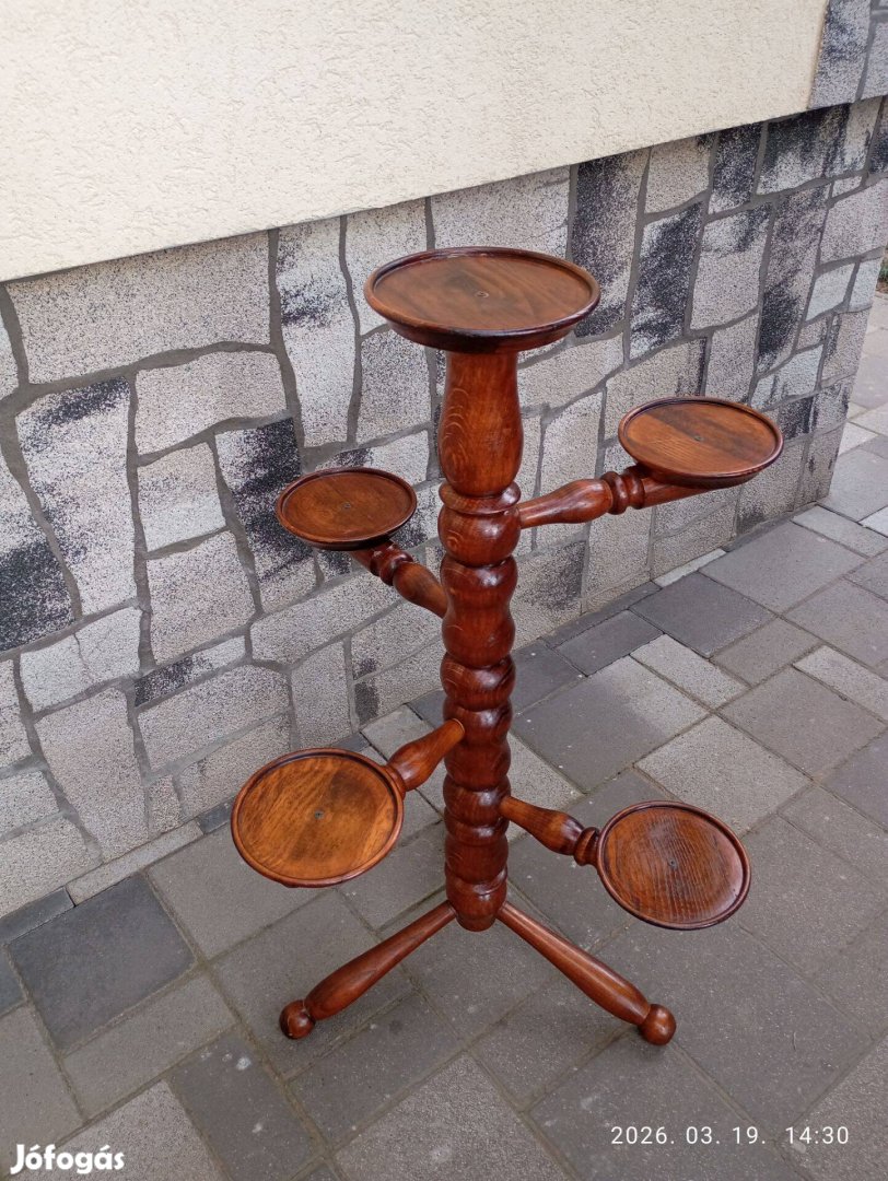 Eladó a képeken látható fa virágtartó állvány. Az állványon 5 cserép virág tárolása lehetséges, 3 stabil lábának köszönhetően nem billeg, biztonságosan megáll. Alig használt, a festése/lakkozása hibátlan.