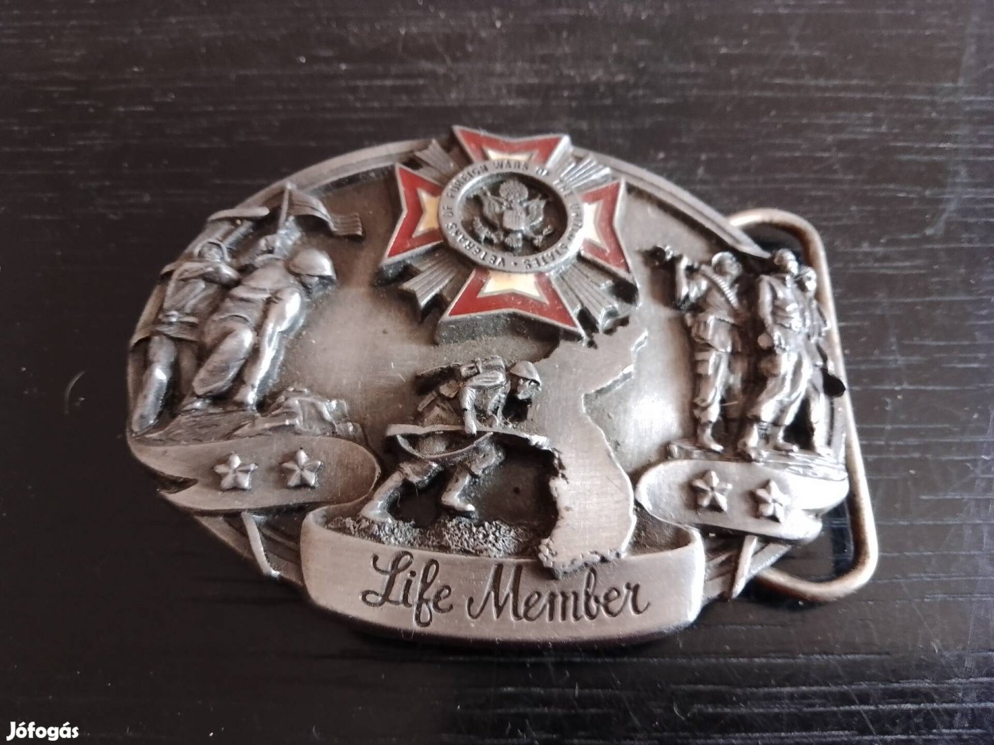 Az amerikai, külföldi háborús veteránok övcsatja. Ónból készült, zománcozott, domborműves övcsat. Méret a képen.