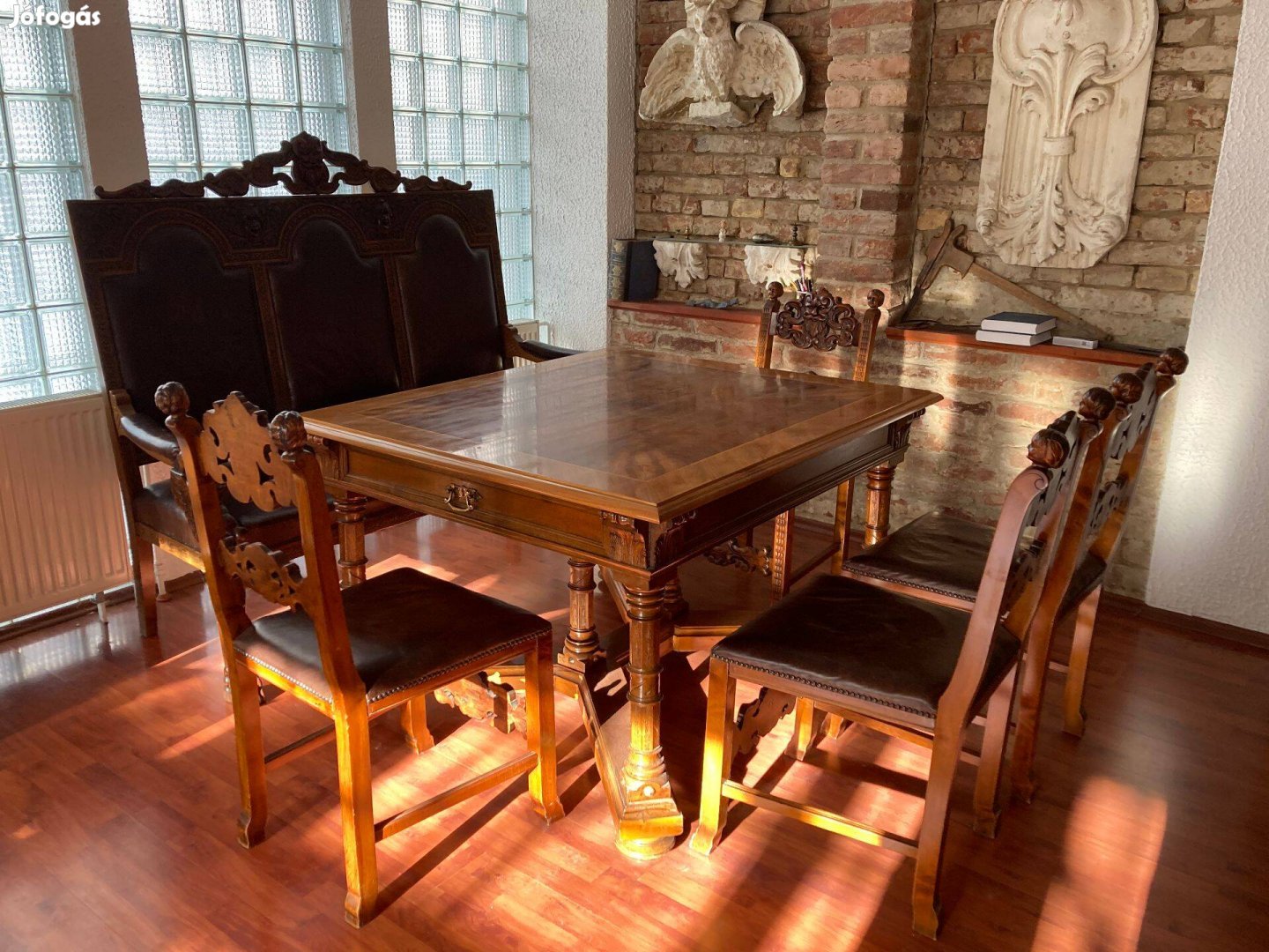 Antik faragott tárgyaló, vagy étkező garnitúra bőr huzattal