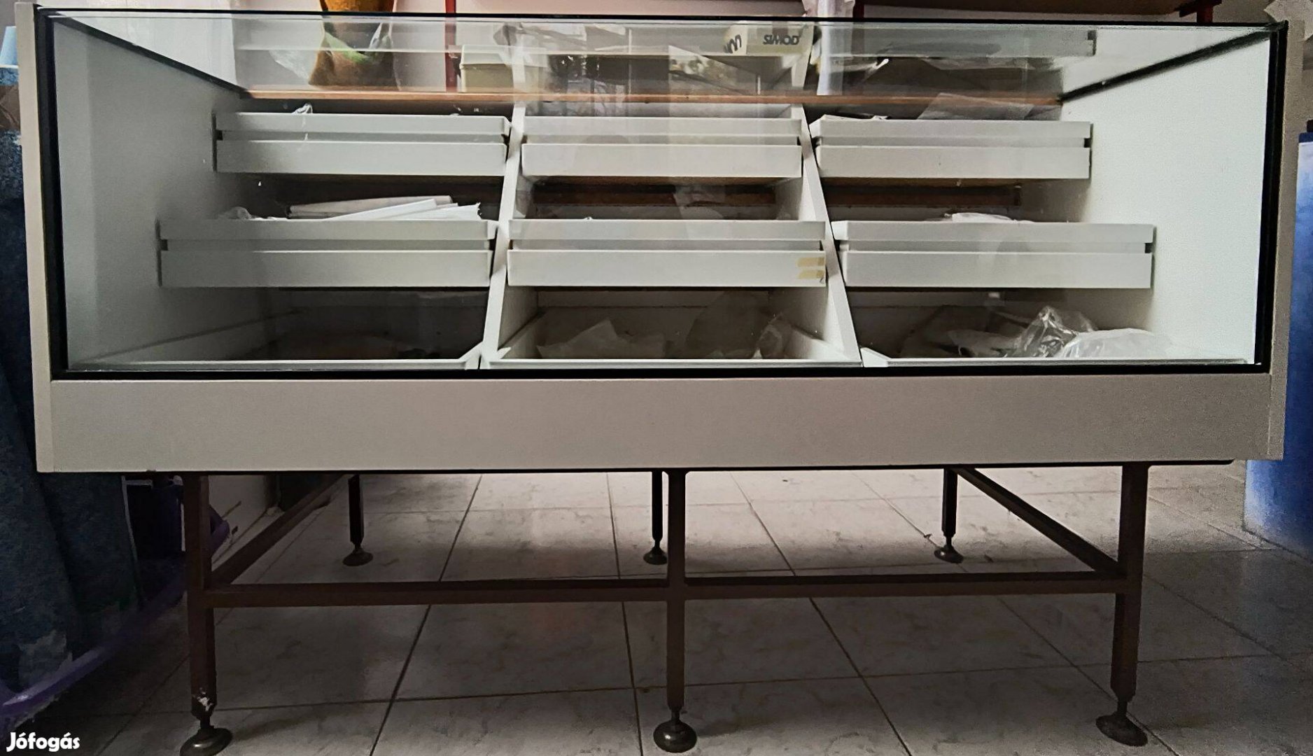Eladó a képeken látható, használt, de megkímélt állapotú 9 fiókos árukínáló üvegpult. Mérete: 140x60 cm.