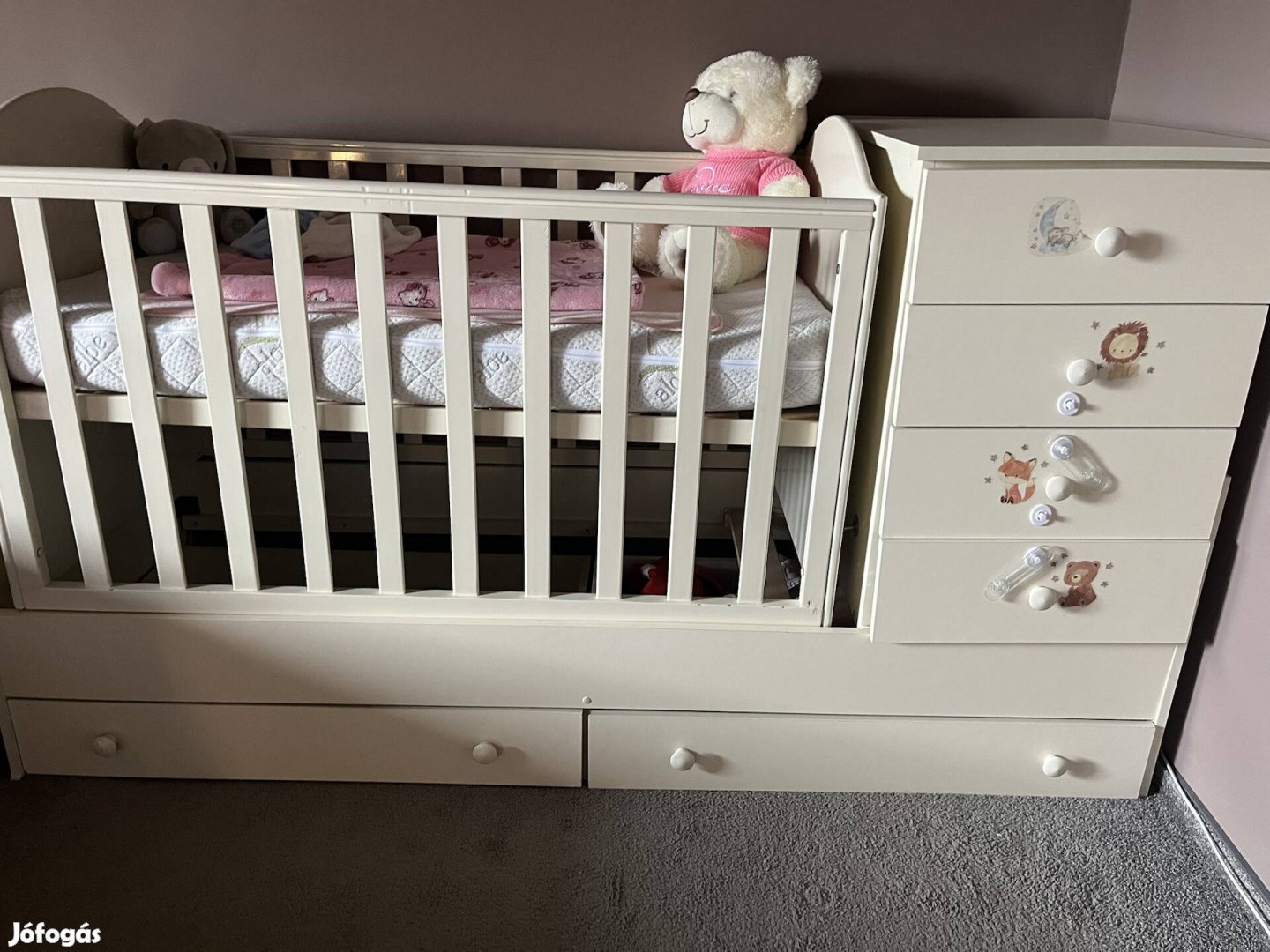 Eladó a képeken látható babaágy pelenkázóval és beépített fiókokkal. Praktikus, helytakarékos darab, sok tárolóhellyel. Stabil, jól használható állapotban van.