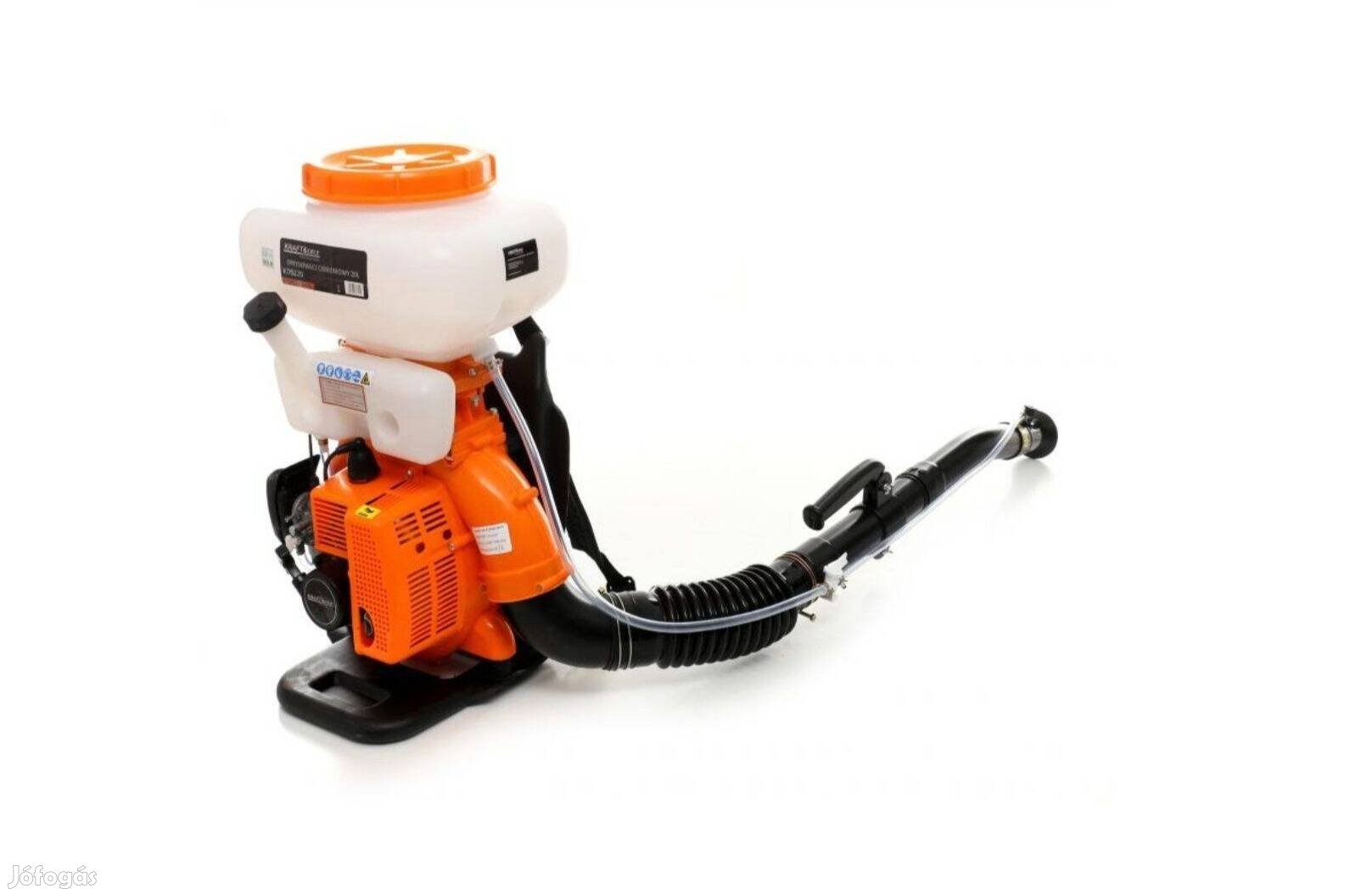 Háti, motoros permetező, hosszú, intenzív munkához. Könnyű kezelhetőség, nagyméretű tartályok, alumínium ventilátor lapát, erős, megbízható motor. Mindenféle növénytípushoz és alkalmazáshoz megfelelően beállítható folyadéksugár.