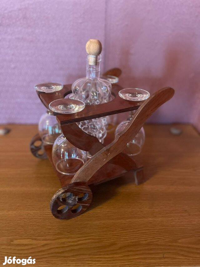 Eladó boros készlet. 4 boros pohár és egy szőlő alakú borotartó üveg fa "zsúrkocsin". Helyileg Nyírmadán vehető át.