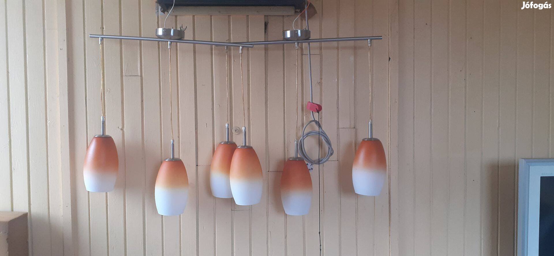 Eladó a képen látható 2 db. Rábalux 3 búrás, bronz mennyezeti lámpa, újszerű állapotban. A tartó cső hossza 60 cm, a hosszabb függő is 60 cm-es.