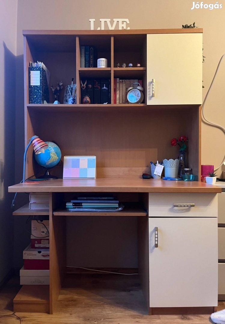 Eladó használt, de megkímélt állapotú íróasztal felső tárolórésszel.