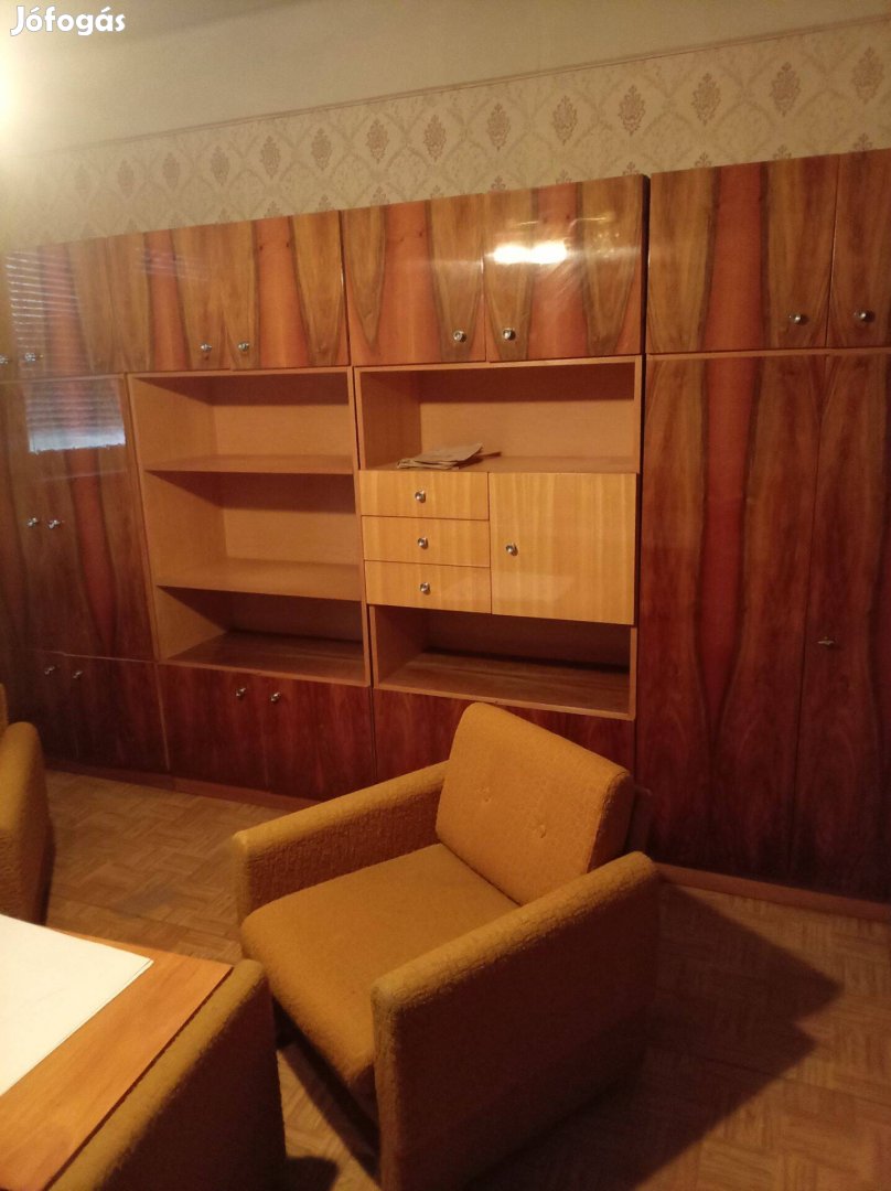 Eladó a képen látható komplett retró szoba bútor mely tartalmaz: 1db szekrénysort, 1db kihúzhatós ágyneműtartós kanapét, 2db fotel és 1db dohányzó asztalt.