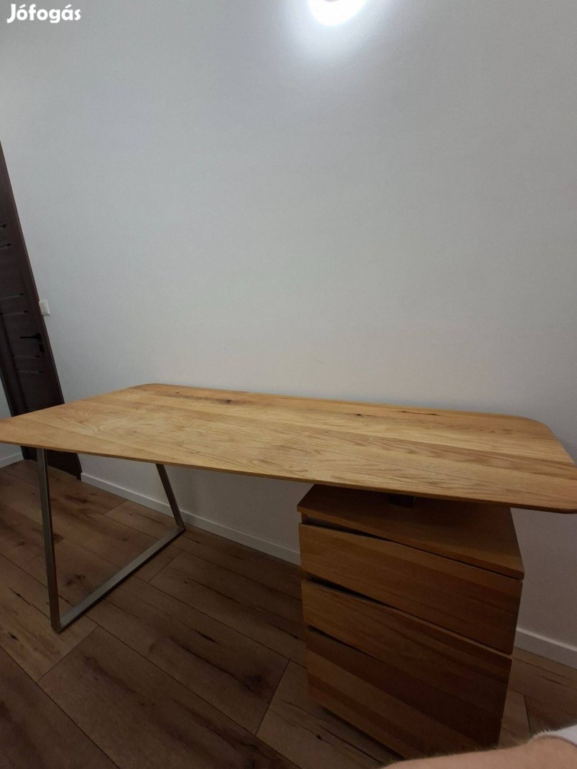 Eladó stílus váltás miatt kiváló állapotban lévő egyedileg készített eredeti tölgyfa design íróasztal fém lábakkal, 3 fiókos szekrénnyel, absztrakt asztallappal.