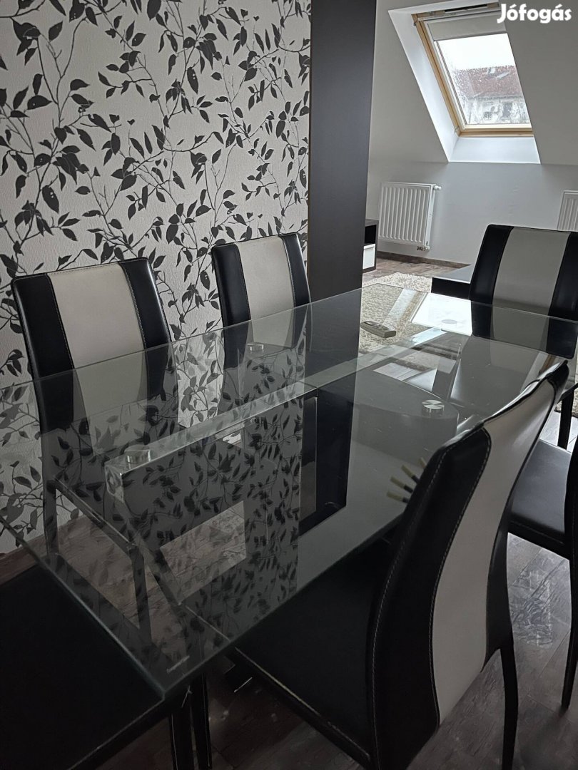 6 személyes üveglapos étkező asztal 100 cm széles és 6 db műbőr bevonású szék jó állapotban eladó .