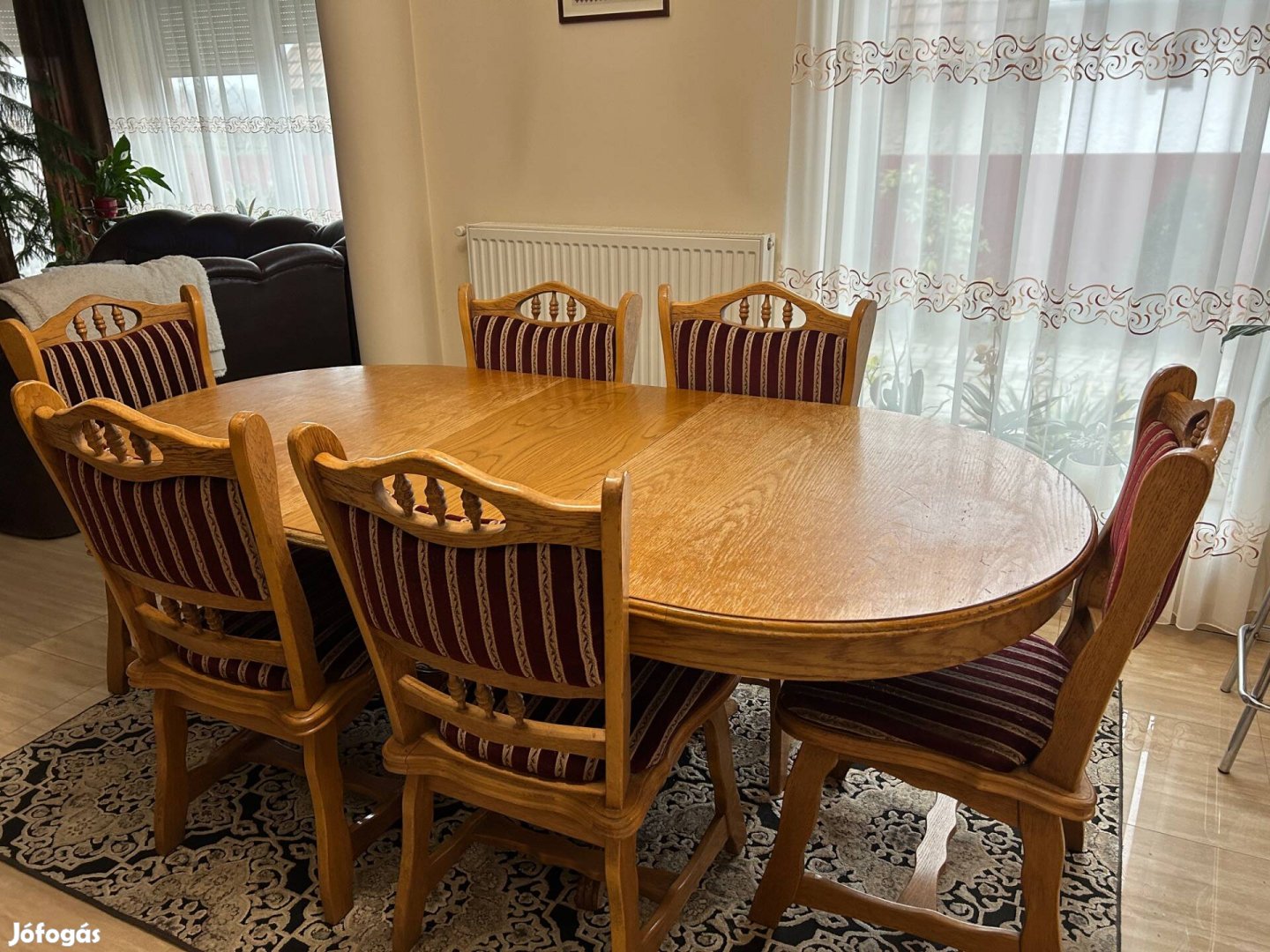 Eladó egy 160 cm hosszú asztal, 3 db 40 cm-es bővíthető betéttel, a hozzá tartozó 6 db székkel, valamint a szetthez tartozó tálalószekrény. A szekrény 152 cm széles 190 cm magas és 45 cm mély.