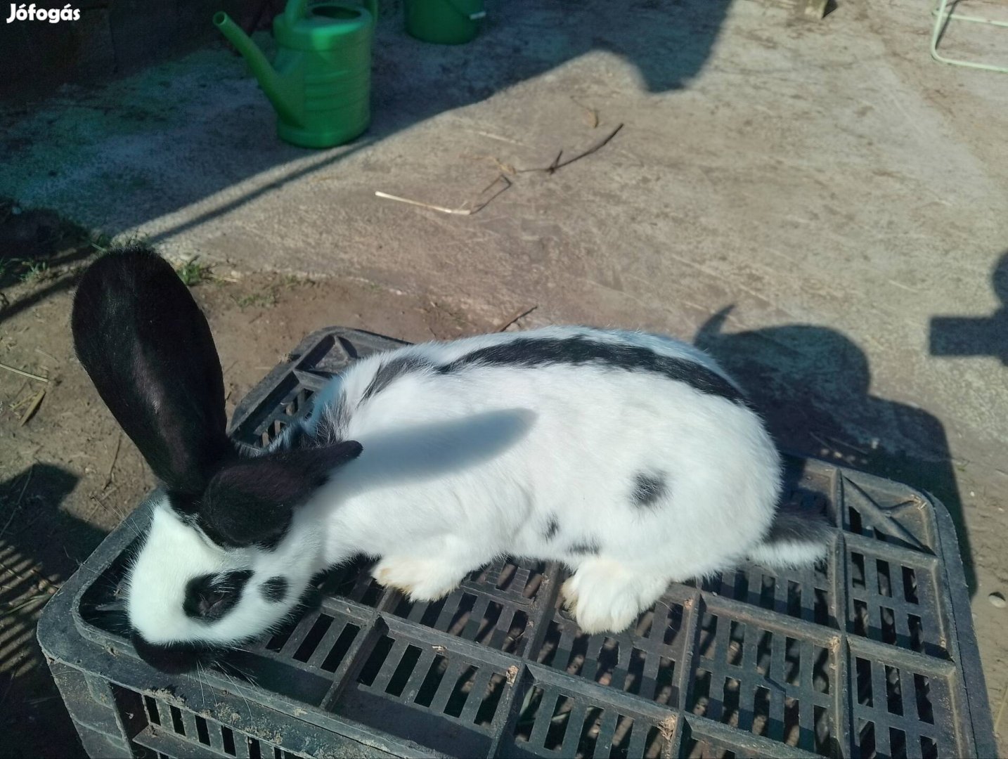 Eladó a képen látható fajtiszta német óriás lepke tarka bak nyúlak közel 4 hónapos fekete és fekete fehér színben.ár.2000ft/kg.érd.