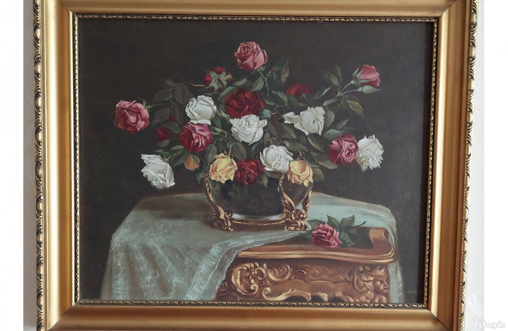 Eladó a képen látható Rózsák kaspóban festmény, restaurált állapotban.