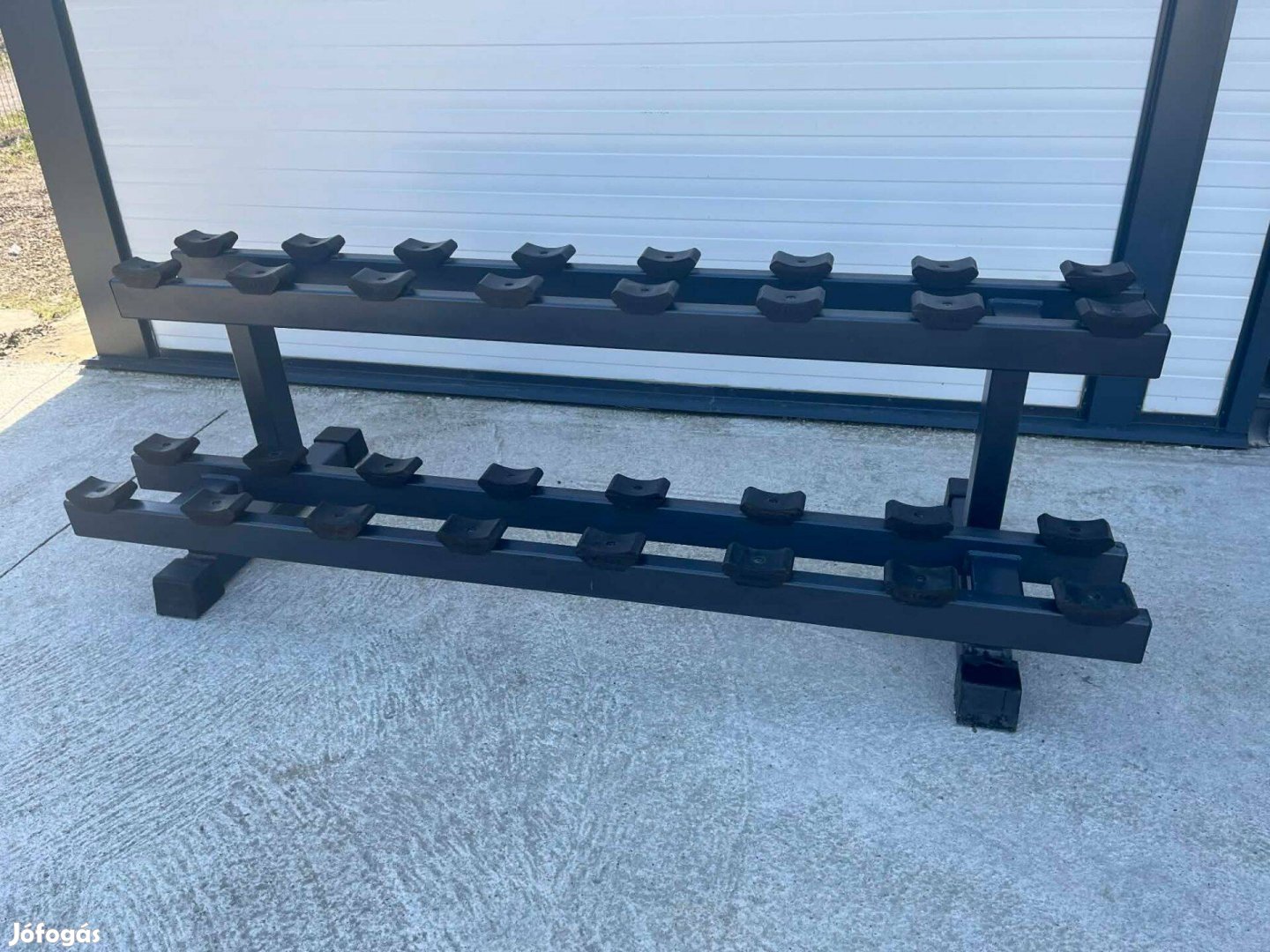 Kiváló állapotban lévő súlyzótartó állvány, 8 pár kézisúlyzó tárolására alkalmas, masszív, felújított külseje révén bármely edzőterembe kiválóan megfelel.