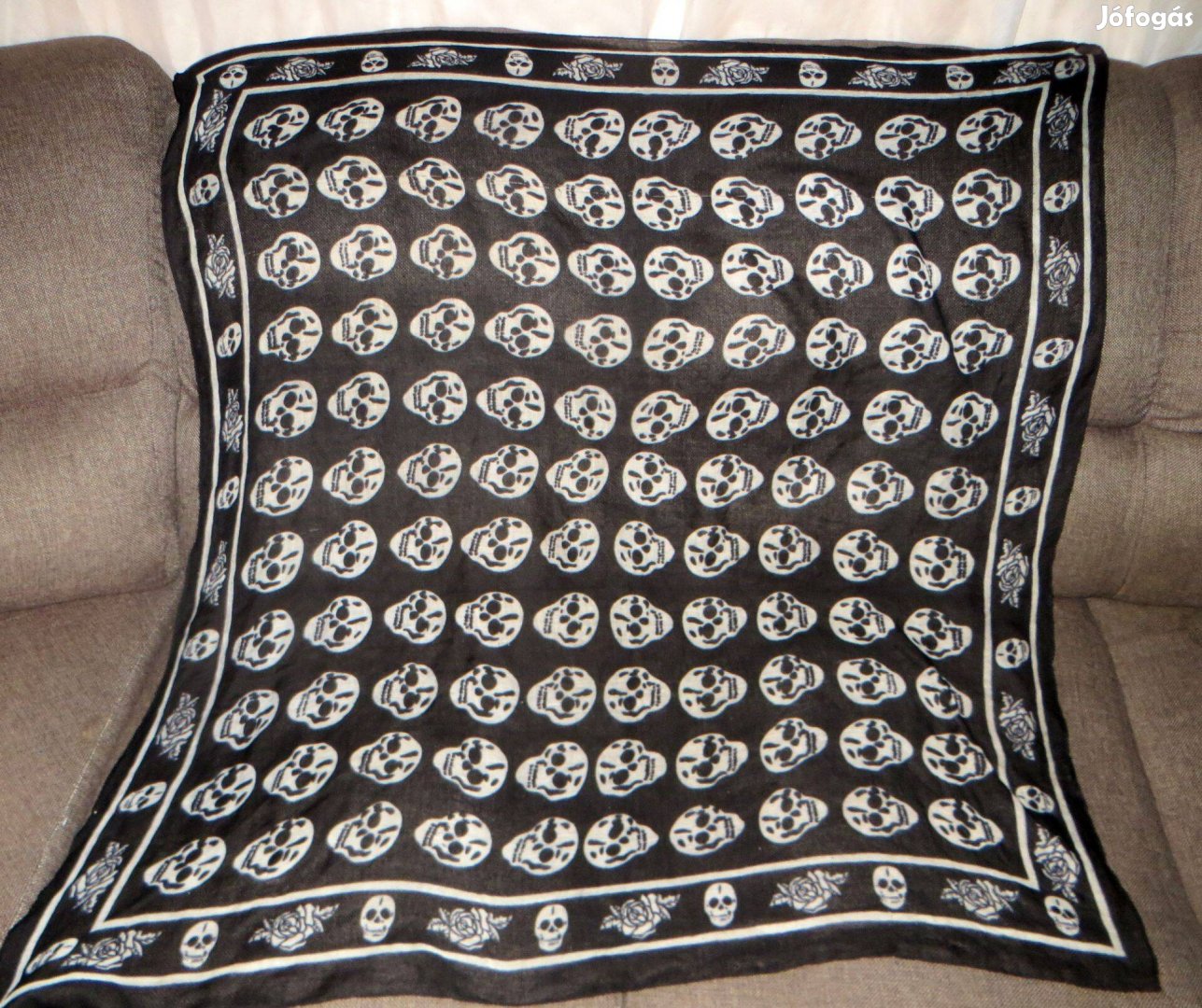 fekete alapon fehér koponyákkal díszített a szélén a koponyák között rózsa is van . Márkajelzés nincs benne.