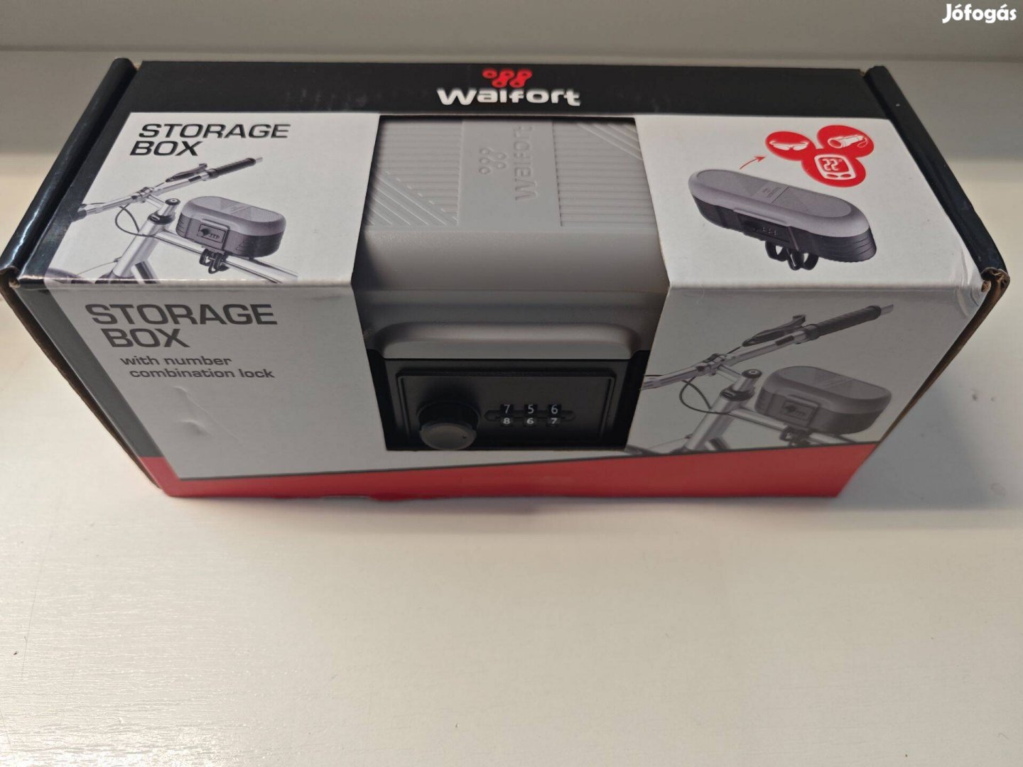 Új, bontatlan, kerékpárra szerelhető számzáras tároló doboz.