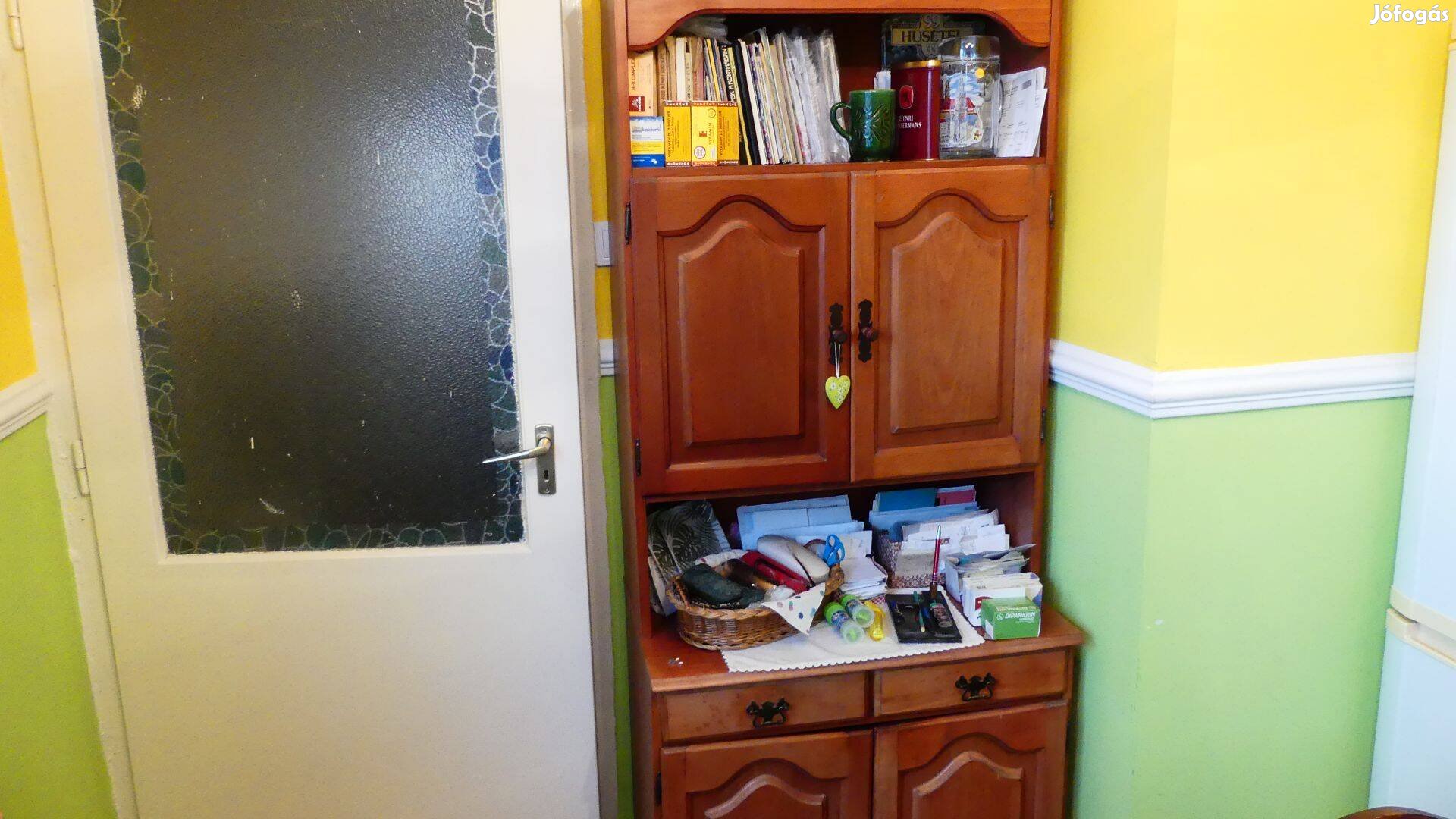Konyhai kellékek, poharak, fűszerek tárolására remek kialakítású, többpolcos szekrény. 190 cm. magas, 78 cm. széles. A felső része leemelhető az alsó kis szekrényről. A méretek miatt csak személyes átvétel lehetséges, vagy futár a vevő szervezésében.