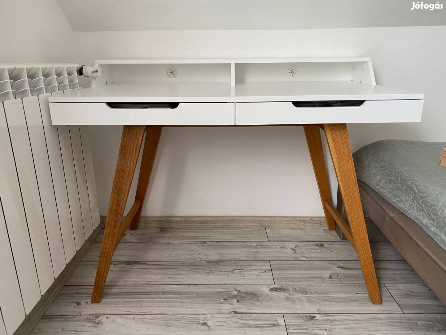 - MDF dekor fehér polcok/2fiók kaucsuk tömör barna lábakkal