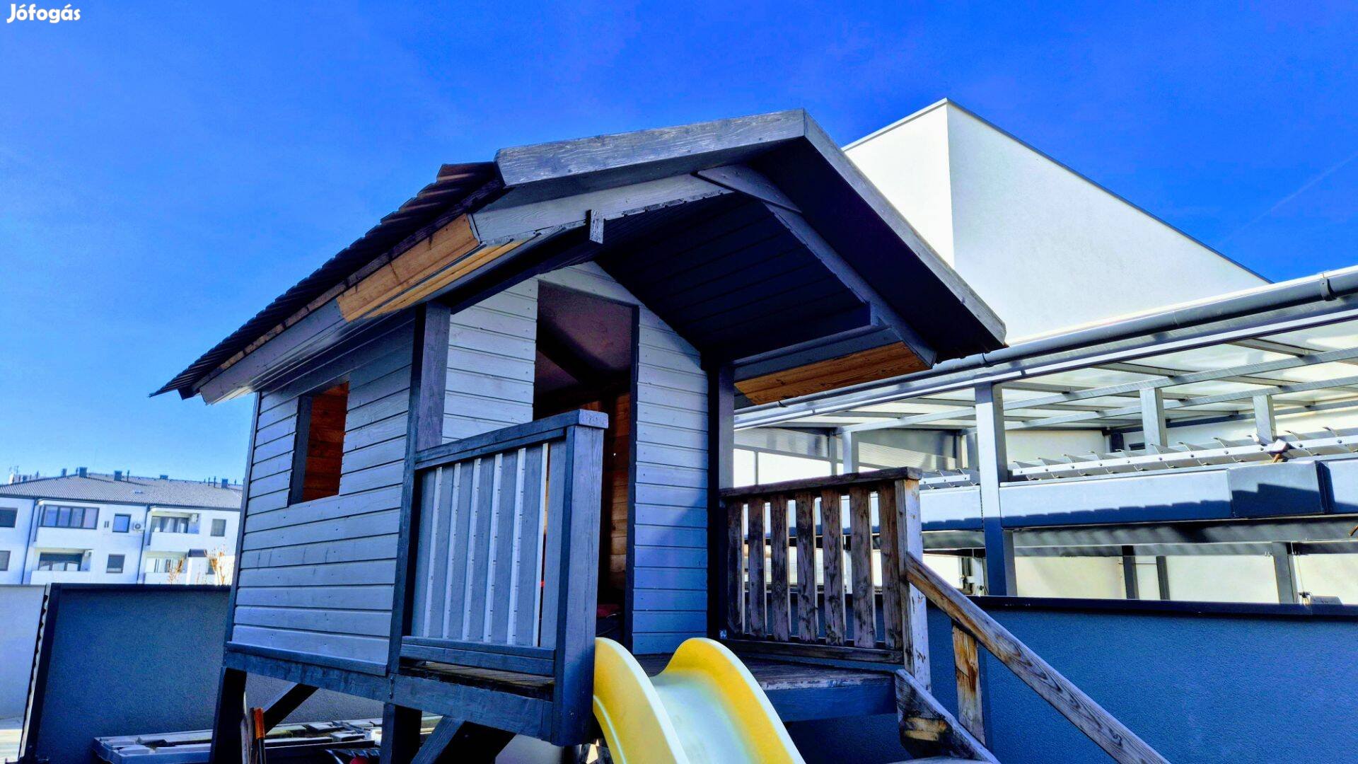 Eladó saját, egyedi építésű, kétszintes gyermek játszóház/faház, csúszdával és mászófallal. Az alsó szinten homokozó, vagy tároló alakítható ki, esetleg azt is be lehet deszkázni.