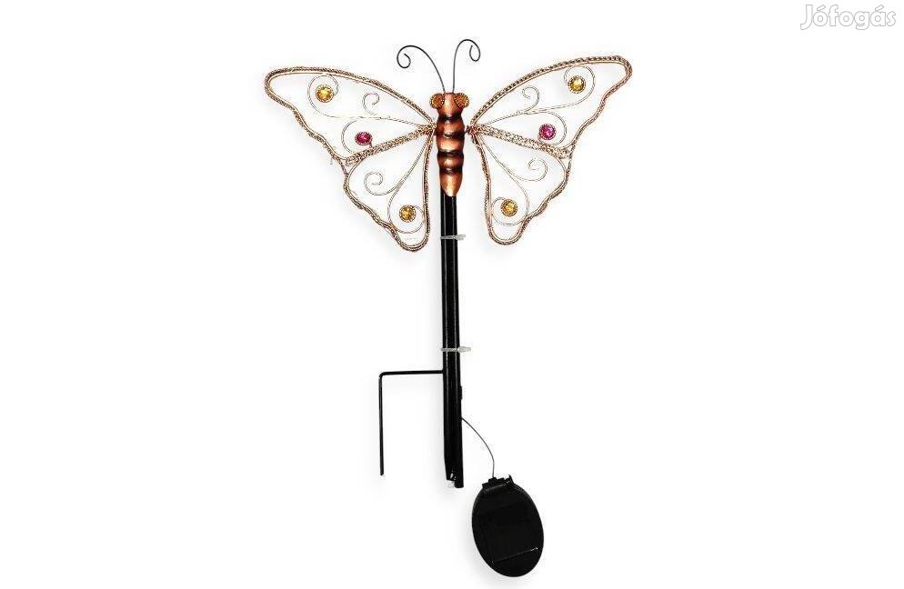 Különleges megjelenésű kerti dekorlámpa bronz színű fém pillangóval és aprólékosan kidolgozott szárnyakkal. A színes kristálykavicsok és a 30 fonott meleg fehér LED elegáns fényt adnak. Napenergiával működik, újratölthető akkumulátorral, vezeték nélkül használható. Be/ki gombbal ellátva.