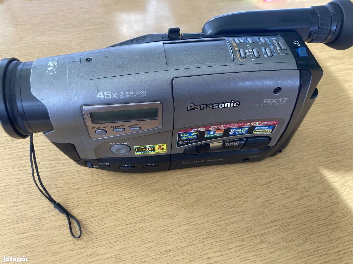 Panasonic NV-RX17 típusú VHS-C videó kamera.A képen látható állapotban,a burkolata felső szürke részén használatból adódó kopások találhatóak.Bekapcsol működik,kazettát lejátssza eddig volt tesztelve,a felvétel nem volt üres kazetta hiányában!Tartozék kamera és a gyári töltő.Az akkumulátora jó de a pontos üzemidejéről nincs információm!