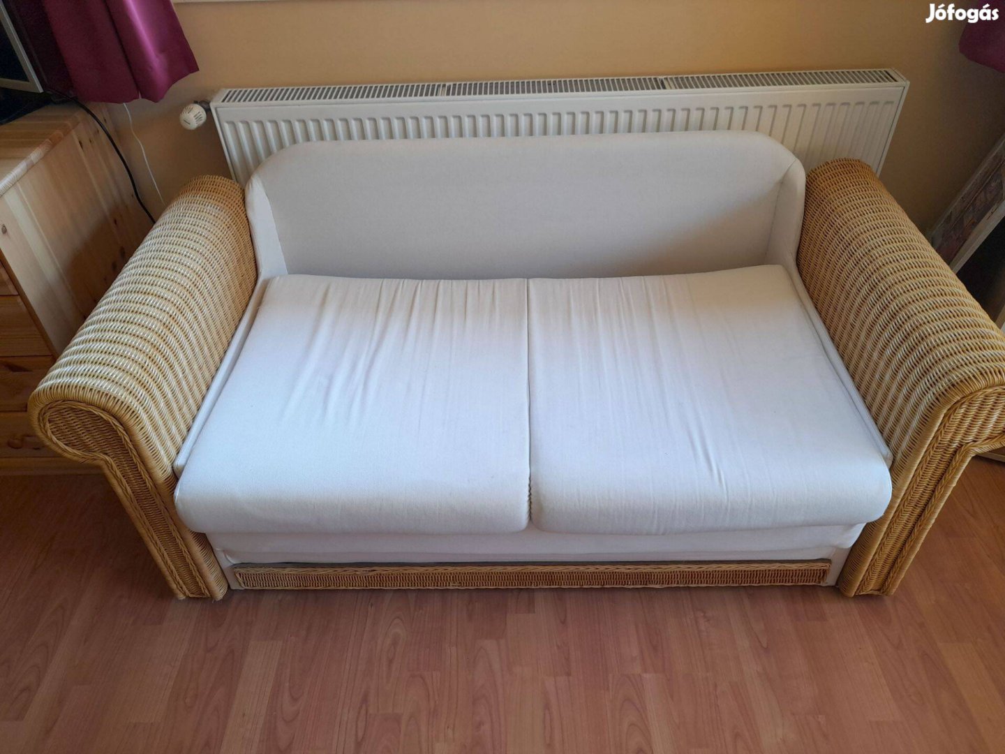 Eladó egy használt rattan vendégágy Nyíregyházán. Mérete: 160*80 cm. Kihúzva a fekvőfelülete 210*120 cm. Az elején a rattan néhány helyen hiányzik. A habszivacs matrac még jó állapotú.