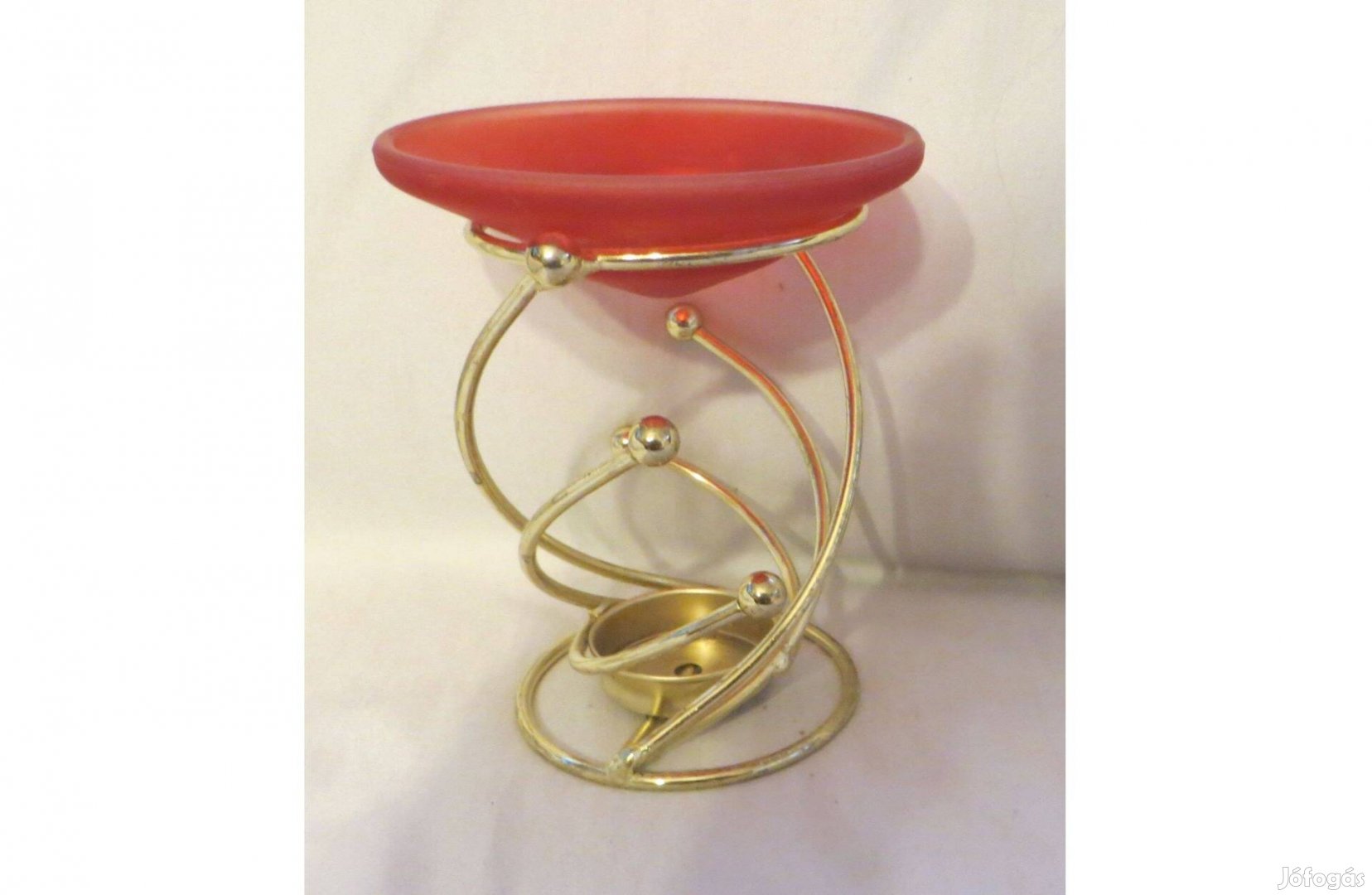 A fémvázas szerkezet alján egy mécsesnek kialakított hely található, felette pedig egy rubinvörösüvegtálka helyezkedik el a víz és az illóolajok számára.