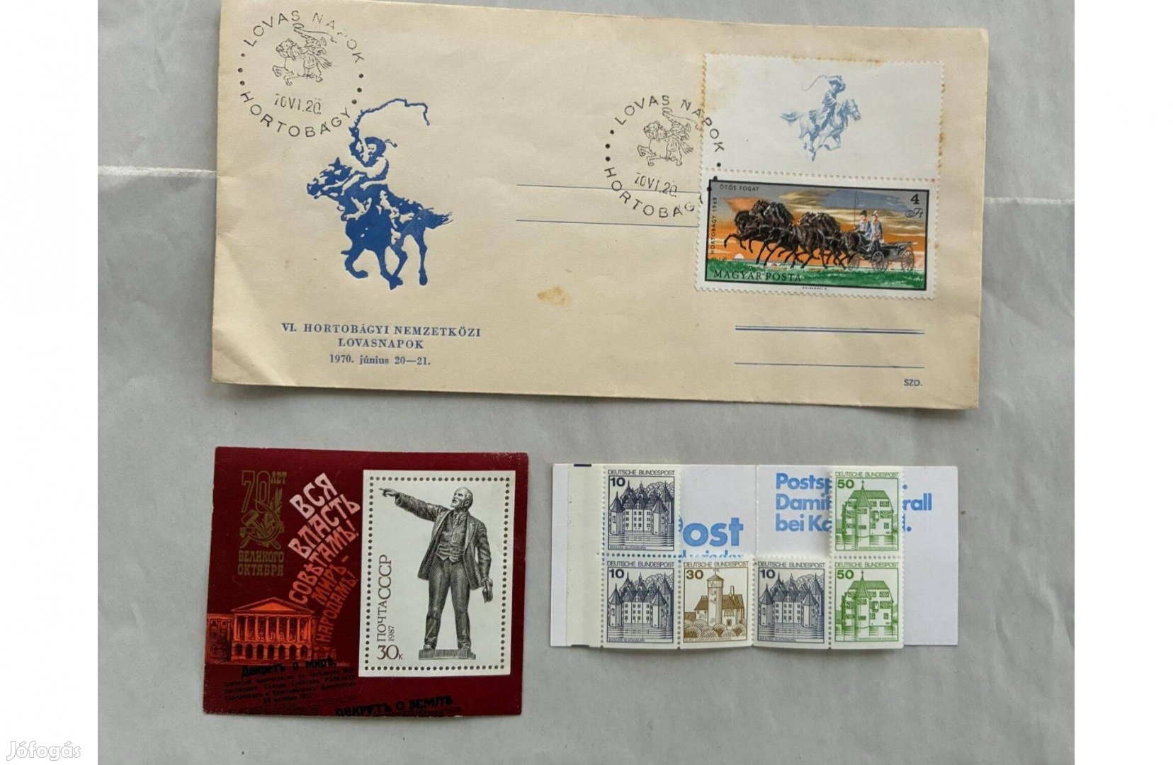 A képen látható retro postatíszta lenin bélyeg és német " kastélyok és Várak bélyegsor és használt Hortobágyi Lovasnapok boríték bélyeggel eladó!