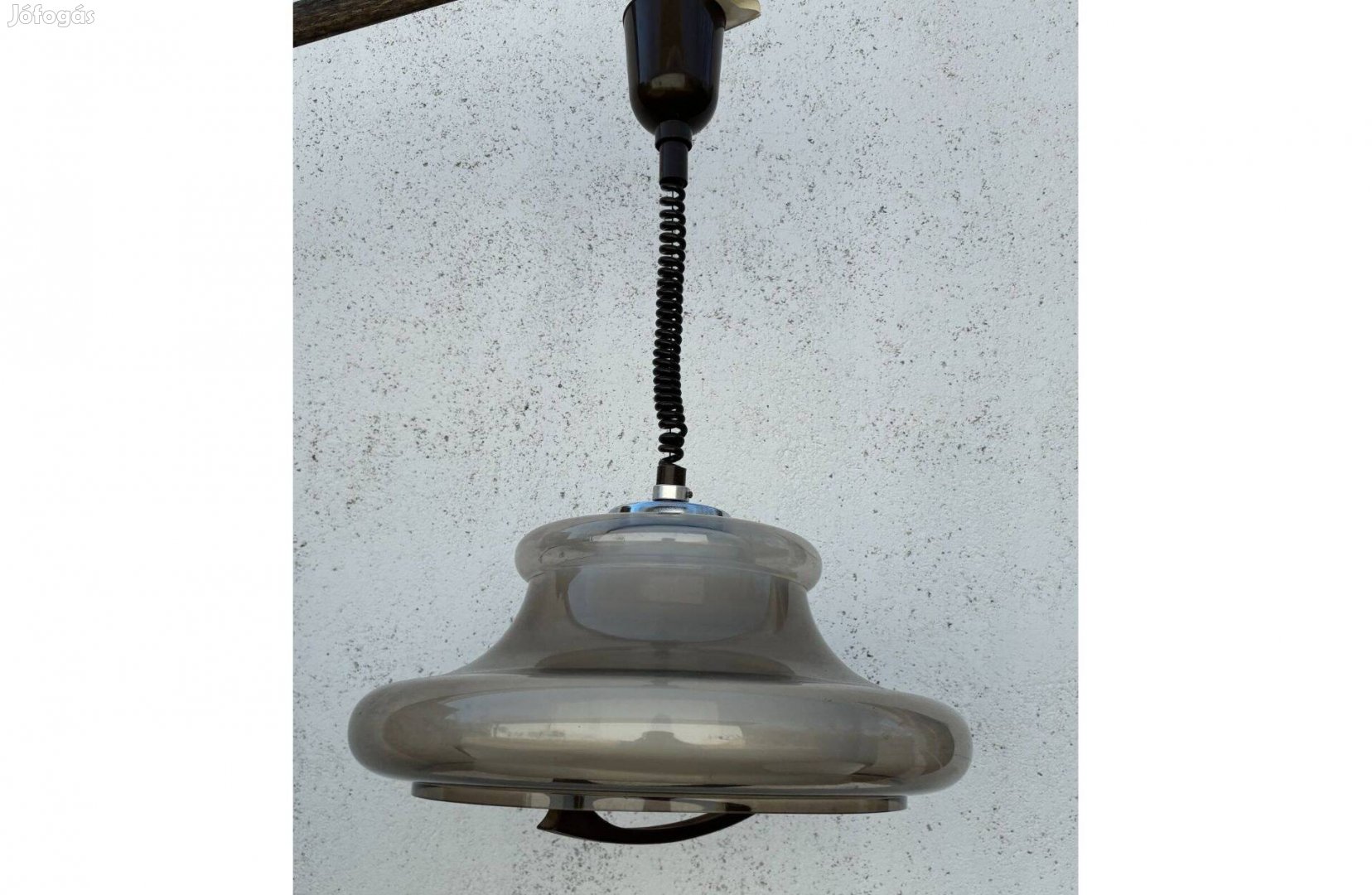 A képen látható Retró szarvasi rugós mennyezeti lámpa eladó! A fehér lámpaburát egy barnás fedőbura takarja.a fedőbura tetején kisebb sérülés van ami a felszerelt lámpánál nem látható!
