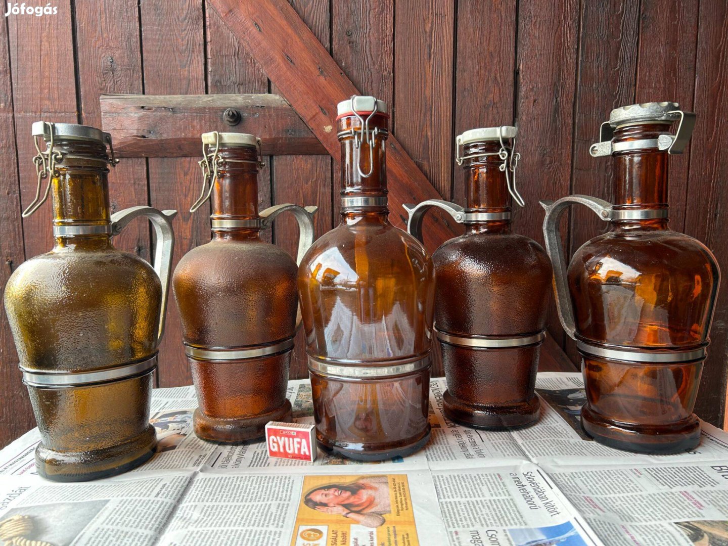 A fotókon látható négy darab 2,5 és egy darab 3 literes csatos sörösüveg.egyben eladó. A jobb oldali sajnos sérült. Külön is fotóztam.