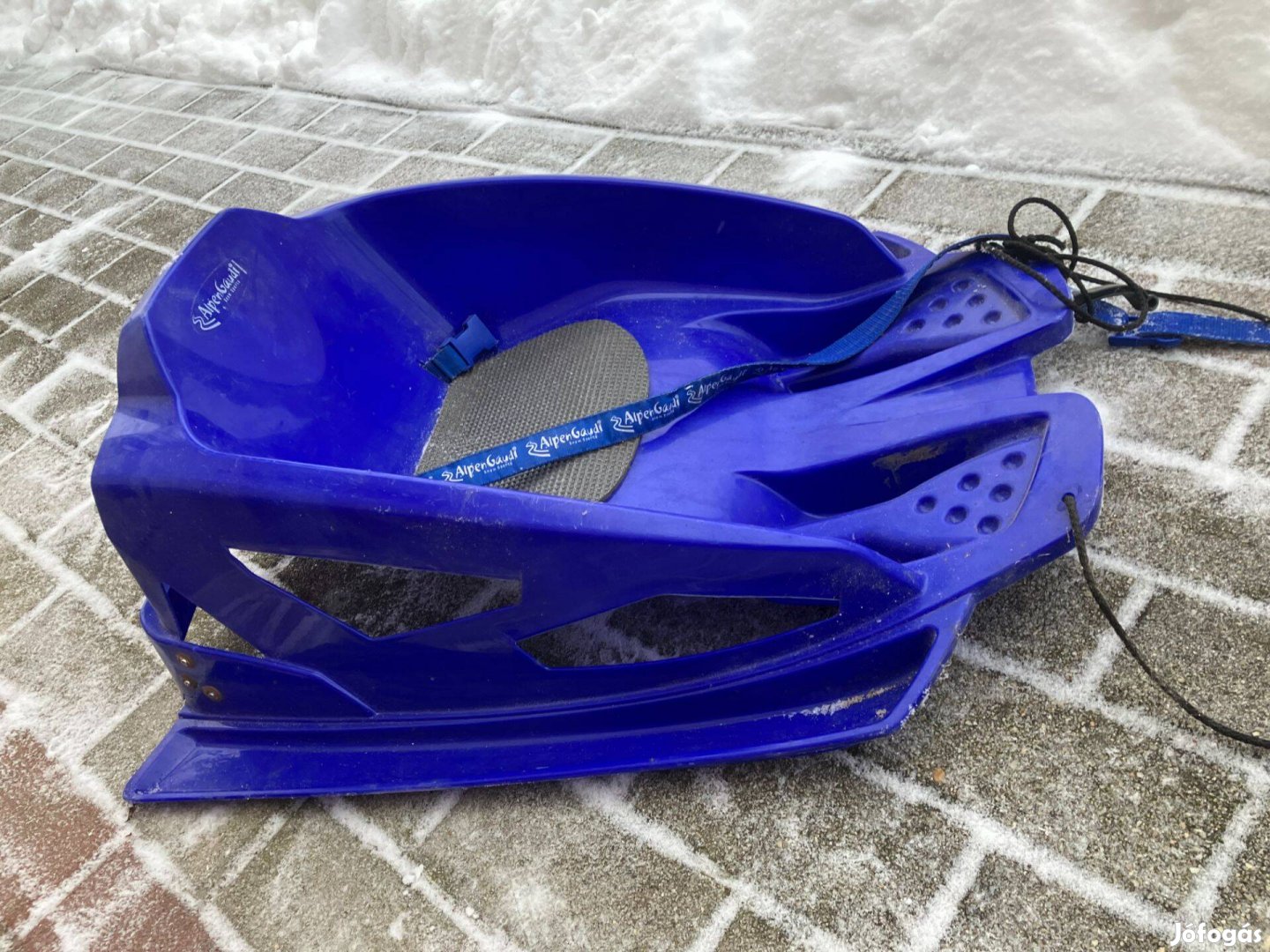 Eladó műanyag szánkó kisebb sérüléssel. A sérülés: hátsó részen a talprésznél meg van repedve. A sérülés két fotón is látható.
