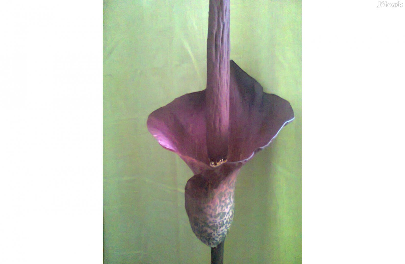 Óriáskonytvirág vagy gumipálma gumók (Amorphophallus konjac: kígyópálma, gumipálma, esernyő pálma, tigrispálma). Nem igényes növény: gumó formában telel, ami megkönnyíti a tárolást. Fagymentes, száraz helyet kell biztosítani számára - hogy óvjuk a kiszáradástól, lazán papírba kell csomagolni. A gumót a méretének megfelelő edénybe kell ültetni (érdemes a gumónál 2-3x nagyobb méretűbe ). A gumó évről-évre nagyobb lesz, így egyre terebélyesebb levélzet fejlődik belőle. A virágja kb. 80 cm magas, közvetlenül a gumóból hajt ki. 1 hétig nyílik, ezalatt roppant kellemetlen szagot áraszt. Miután elvirágzik, elkezd fejlődni maga a növény. Ősszel ellankadnak a levelei, melyeket ha enyhe húzásra kézben marad a szára, akkor ki lehet venni a földből a gumókat, hogy téli szálláshelyére tegyük. A gumó Ára: 950 Ft 1 db nagyobb + két kisebb grátisz, amit postázni tudok a vásárlónak megfelelő módon.