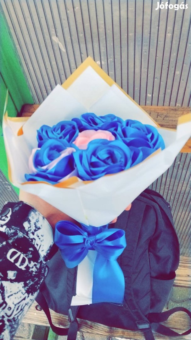 Kézzel készített szatén rózsákból álló egyedi csokor, igényes csomagolásban és díszmasnival.
