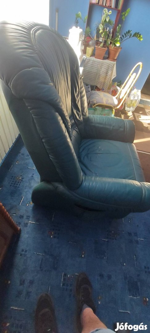 Bőr fotel eladó. Zöld színben, távirányítós, gurulós. A hátulján 2 kicsi szakadás.