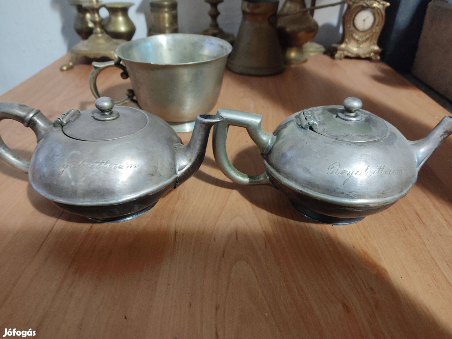 Eladó a képen látható antik, 2db kévés kanna és egy cukor tartó, Ahogy a képeken látni voltak javítva, Az oldalukon Royal Éterem felirat látható, Nem postázom,