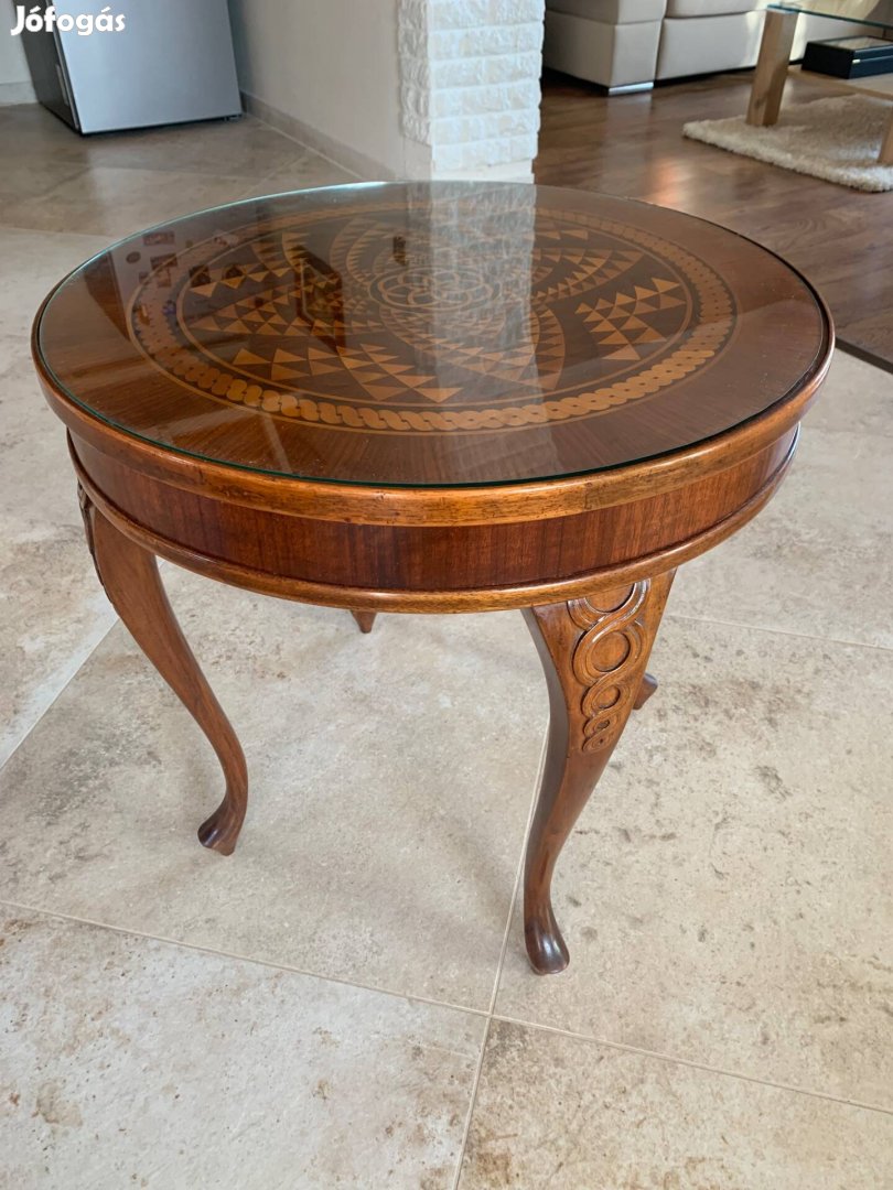 Neobarokk antik szalonasztal, egyedi darab, kézzel készült mandala mintájú intarziás felülettel, rajta cserélhető üveglappal, faragott lábakkal, gyönyörű állapotban eladó.