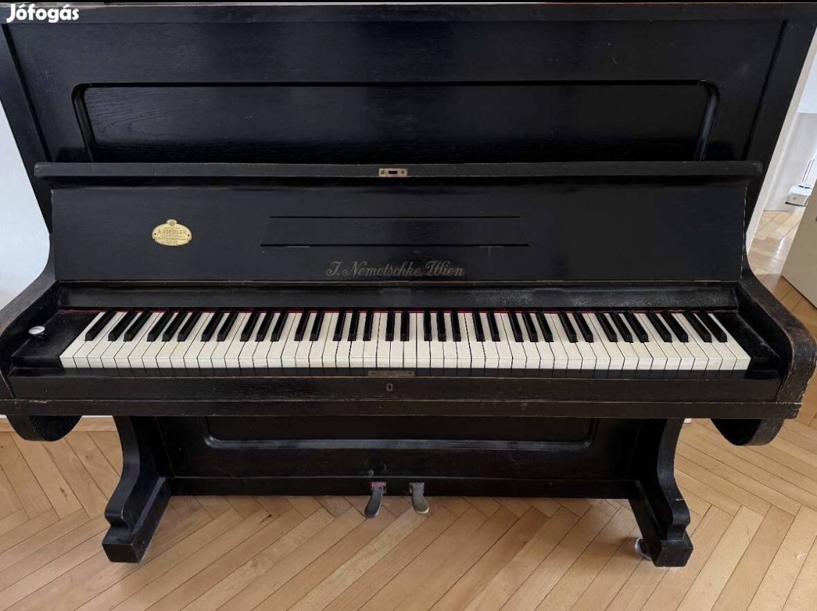 Eladó egy antik, fekete pianínó Bécsi gyártótól: J. Nemetschke, Wien felirattal.