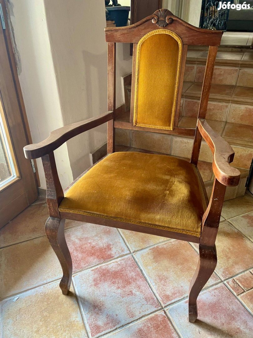 Faragott fa váz, ívelt karfákkal és lábakkal készült, a kárpit pedig aranybarna bársony, ami elegáns megjelenést kölcsönöz neki.